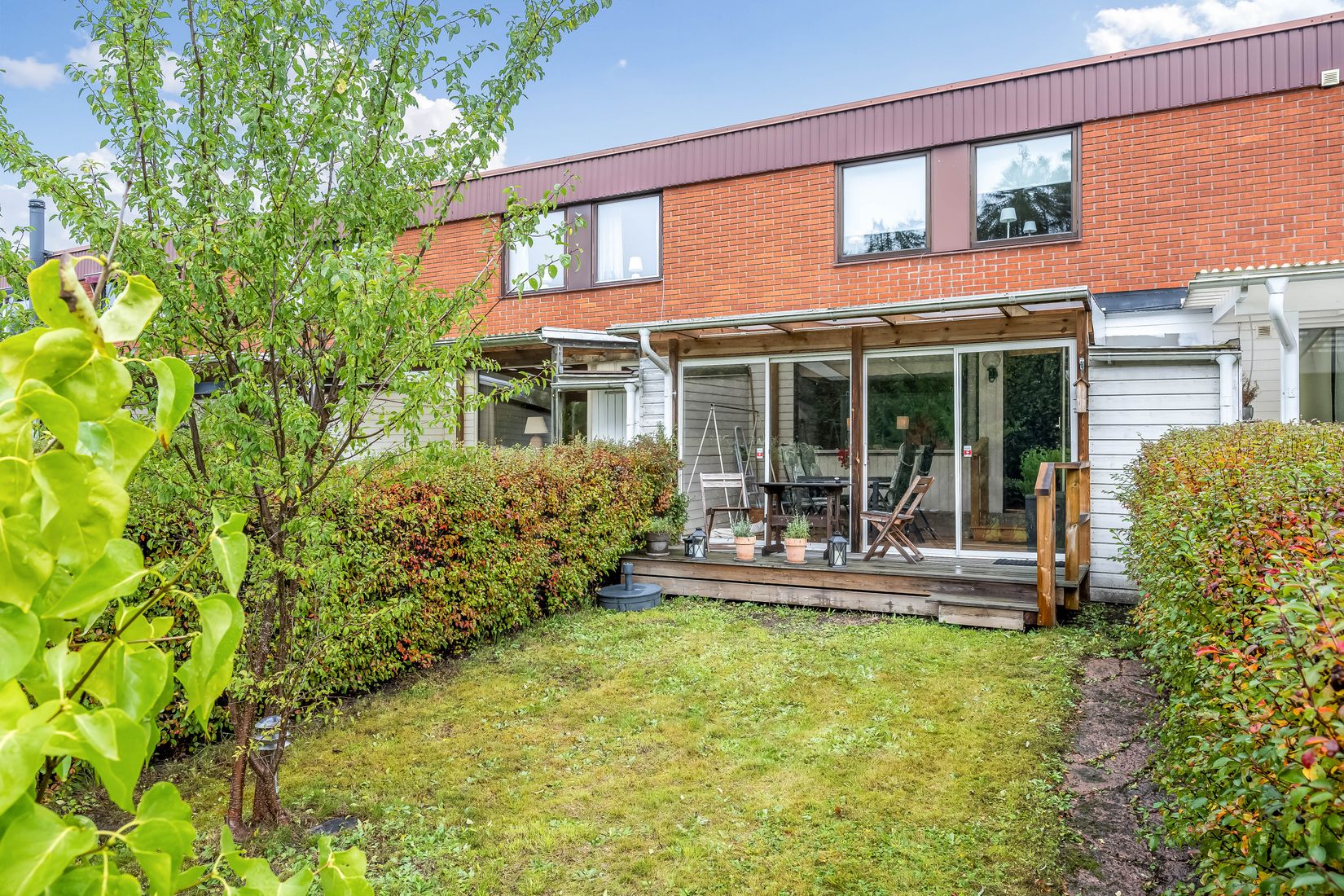 Tomten är lättskött med gräsyta, häckar och det inglasade uterummet som blir en naturlig samlingsplats under stora delar av året. Tack vare läget mot grönområdet skapas en extra känsla av rymd och lugn.