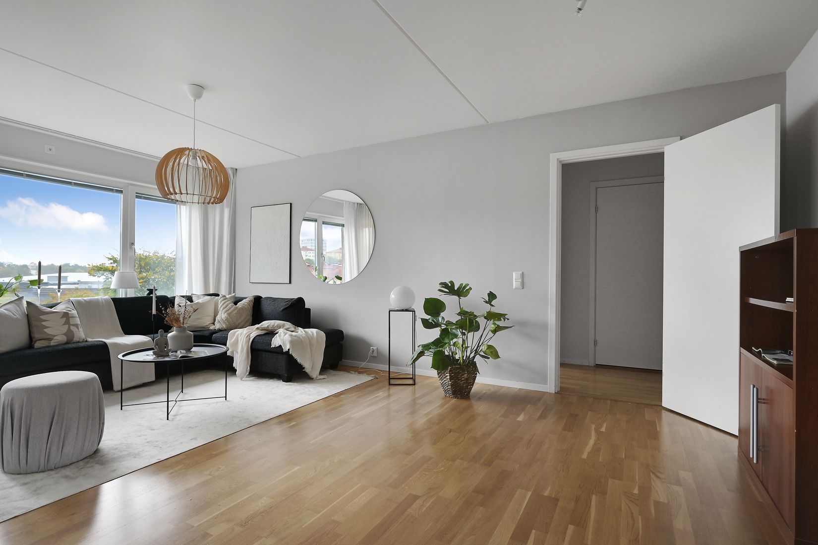 Bostaden är genomtänkt planerad med fyra sovrum i varierande storlekar, två badrum samt en delvis öppen planlösning mellan kök och vardagsrum som skapar generösa sällskapsytor. Balkongen i eftertraktat söderläge bjuder på både förmiddags- och eftermiddagssol – en perfekt plats för avkoppling. Läget högst upp i huset ger dessutom ett insynsskyddat och rofyllt boende.