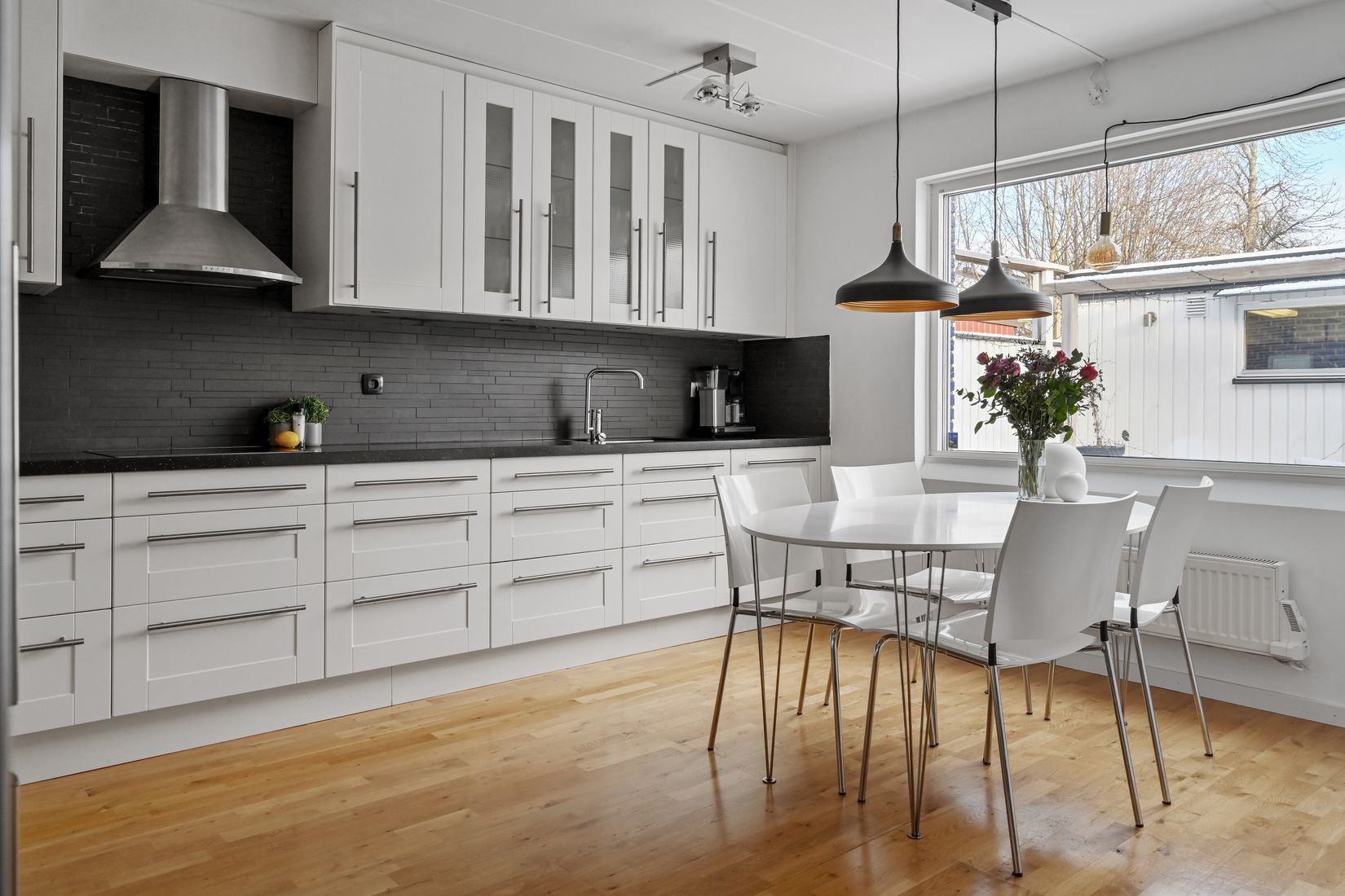 Köket är ljust och stilrent med vita skåpsluckor, mörk stenbänk och svart kakel ovan arbetsytorna, fullt utrustat med spis, ugn, micro, kyl/frys och diskmaskin. Här finns också plats för matbord och sociala måltider. Vardagsrummet är stort och ljust med parkettgolv och utgång till altanen som förlänger sällskapsytorna utomhus.