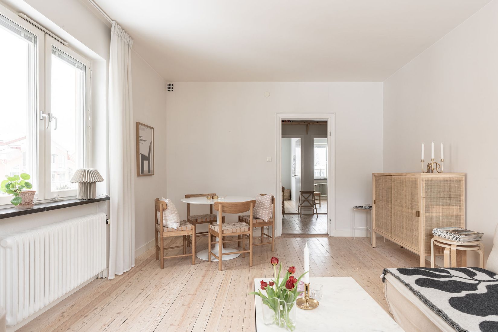 Vardagsrummet är luftigt och socialt med gott om plats för både middagar och lugna kvällar hemma. När eftermiddagssolen kommer fram kliver du ut på den trivsamma balkongen och njuter av stunden.