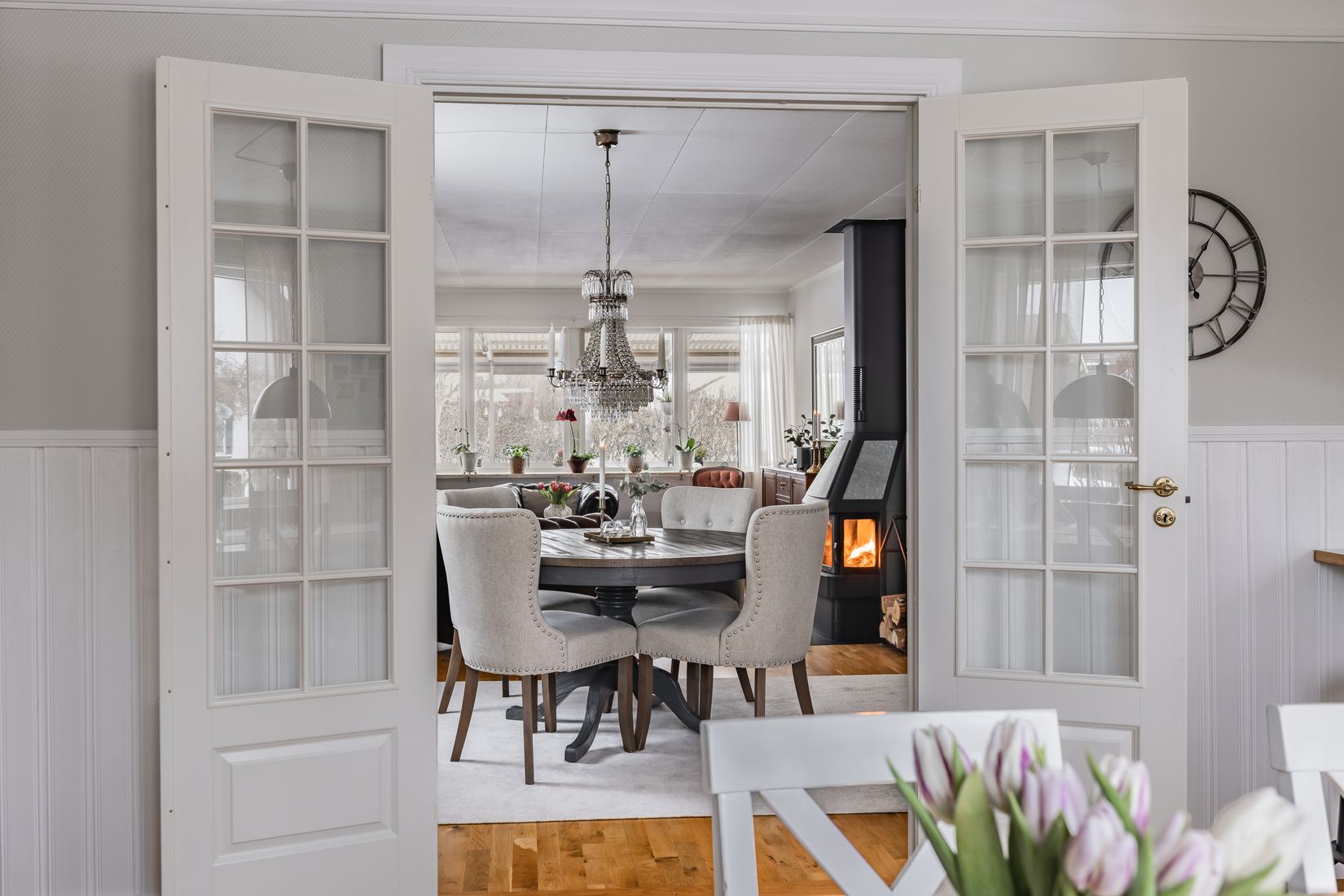 Planlösningen är genomgående och väl disponerad vilket skapar ett fint och praktiskt flöde mellan rummen. De allmänna ytorna binds samman på ett naturligt sätt och mellan umgängesytorna och matrummet finns vackra dubbeldörrar i glas med spröjs som förstärker känslan av rymd. Ljusa väggar och golv bidrar till ett enhetligt och trivsamt intryck. Köket är fint och funktionellt med allt man behöver och den separata tvättstugan är utrustad med diskbänk och ho.