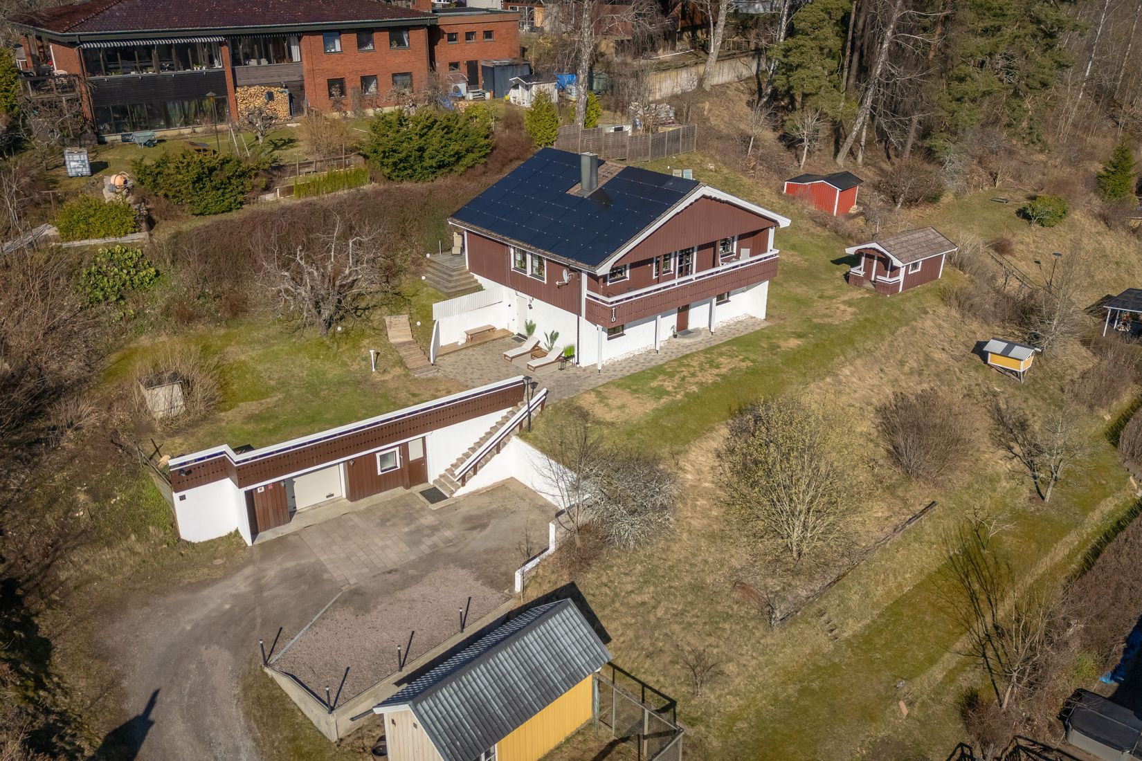 Fastighetens baksida är lummig, privat och erbjuder flera uteplatser i olika väderstreck så du alltid kan välja sol eller skugga efter önskemål. Det isolerade uterummet, utrustat med infravärme, kan användas året runt och blir snabbt en favoritplats för både vardag och fest.