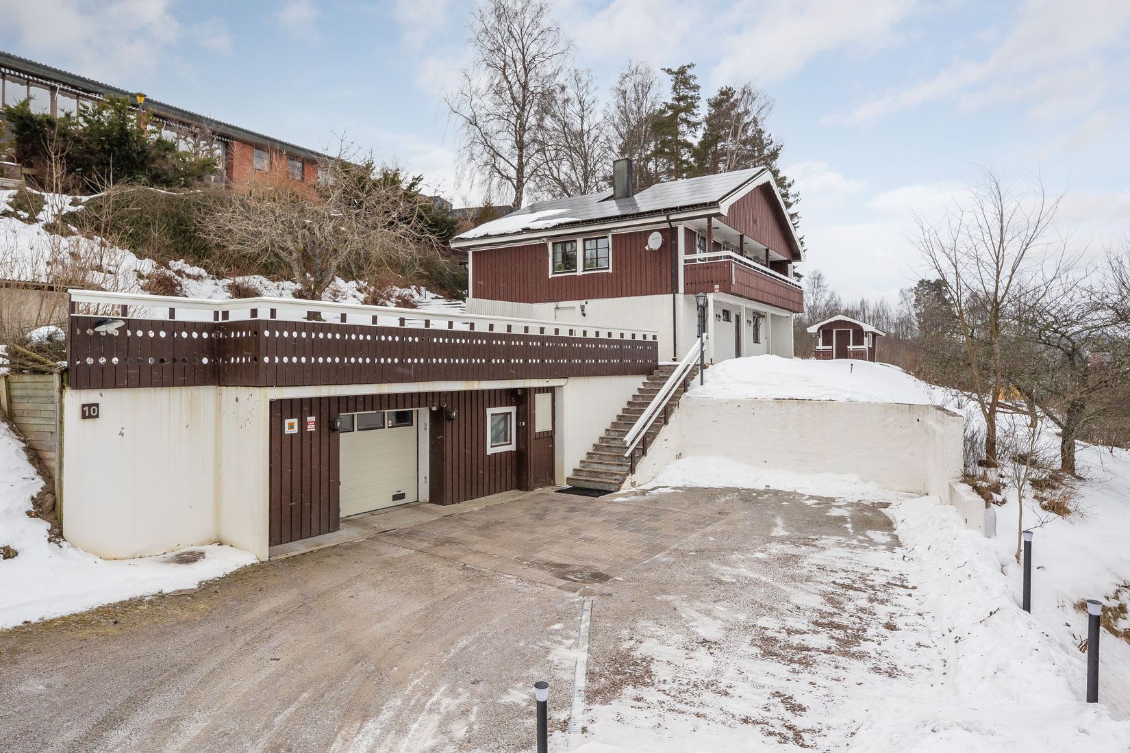 Redan vid ankomst möts du av en stor uppfart med gott om parkeringsmöjligheter för flera bilar, husbil eller husvagn. Det rymliga garaget är utrustat med el-bilsladdare, varmvatten, avlopp samt värme vilket ger både praktiska förvaringsmöjligheter och bekvämlighet i vardagen.