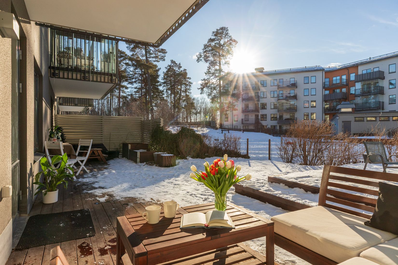 Uteplatsen är bostadens absoluta kronjuvel – en privat oas som bjuder på sol stora delar av dagen och långt in på kvällen. Här finns gott om plats för både bekväma loungemöbler och en större matgrupp, vilket skapar en naturlig samlingspunkt för umgänge, somriga middagar och avkopplande stunder i en rofylld och insynsskyddad miljö.