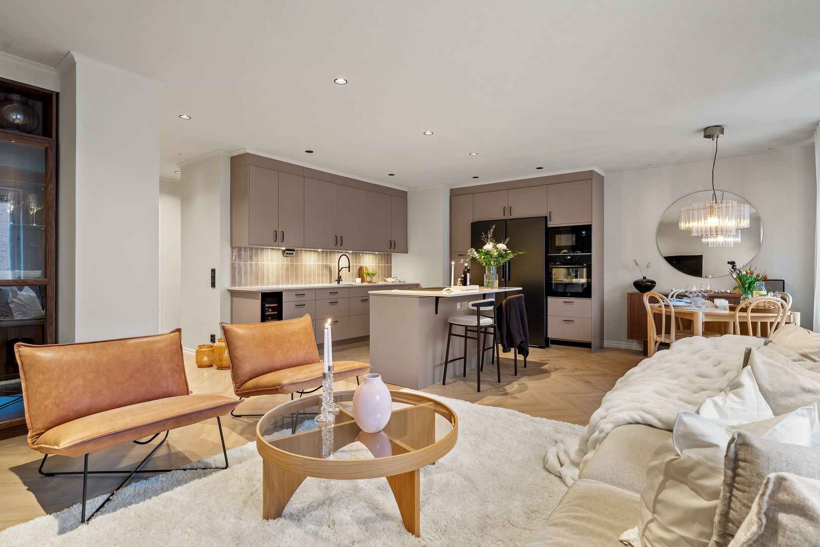 Lägenheten är totalrenoverad och riven ner till betongen. All el och vatten är helt ny, med Plejd installerat genomgående i hela bostaden. Samma dimbara svarta spotlights används i alla rum för ett enhetligt uttryck. I hela lägenheten ligger ett exklusivt fiskbensgolv som är individuellt knackat