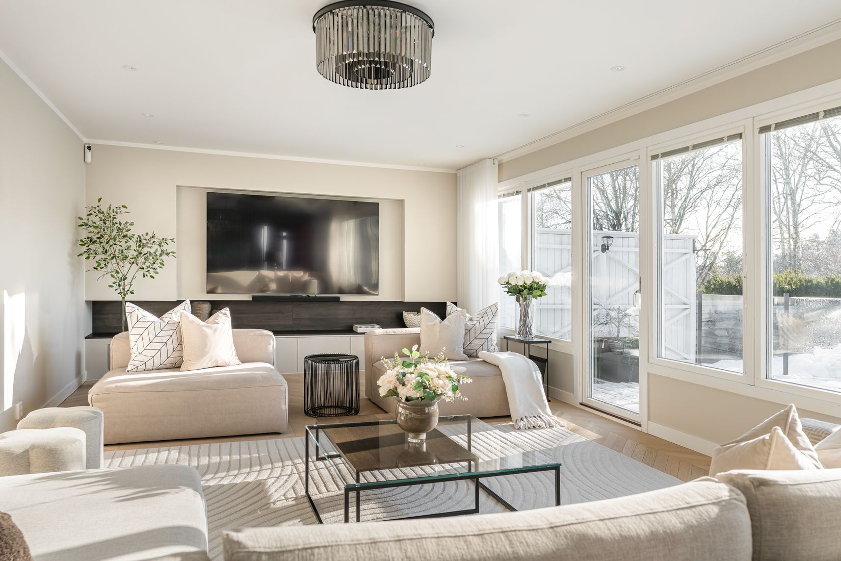 Vardagsrummet är rymligt och ljust med stora fönsterpartier som förstärker känslan av rymd. Den platsbyggda nischlösningen för TV och multimedia bidrar till ett sobert och välbalanserat uttryck där helheten får stå i fokus.