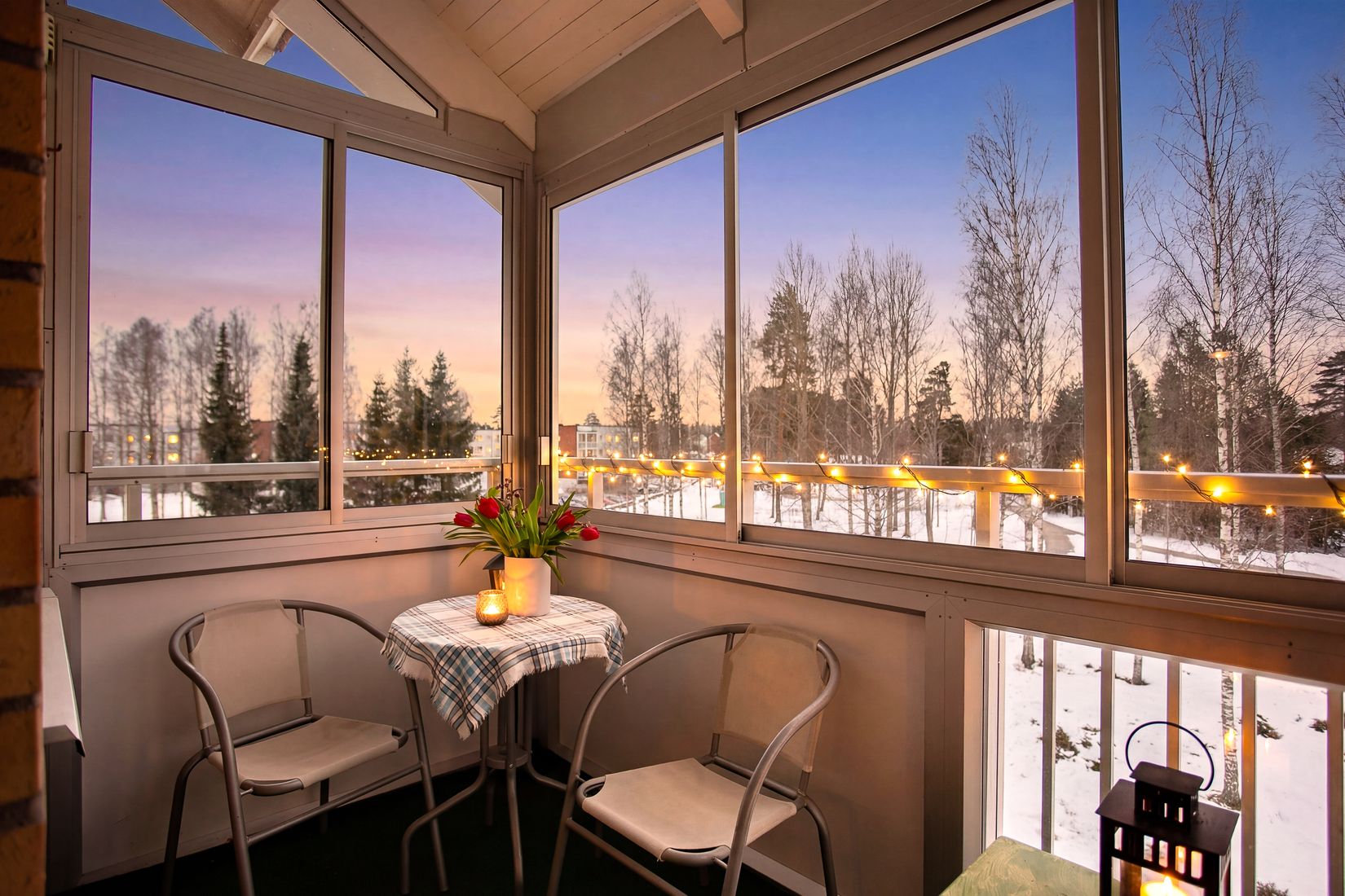 Den öppna planlösningen mellan kök och vardagsrum ger en naturlig samlingspunkt, perfekt för både vardagliga stunder och sociala tillfällen. Ifrån vardagsrummet når du den inglasade balkongen med ett fritt läge mot omgivningarna, här kommer du kunna njuta av dagen under stora delar av året.