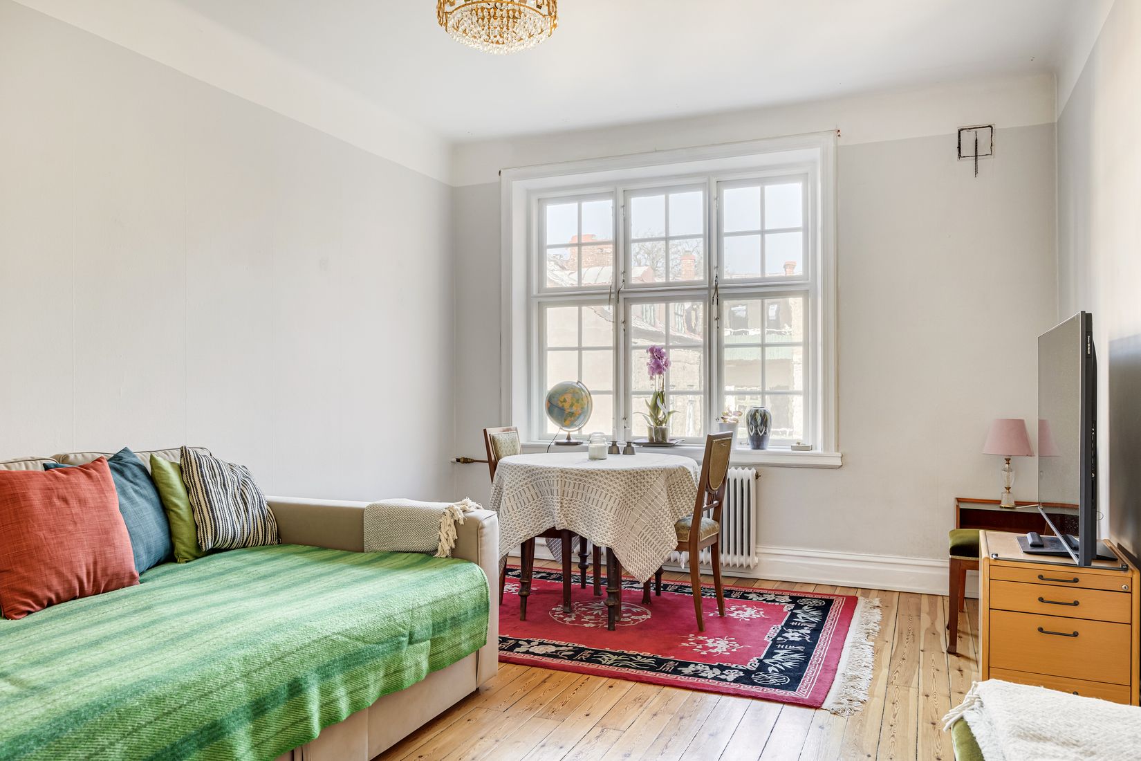 Vardagsrummets fönster vetter mot den lugna innergården och bjuder dessutom på en utsikt mot anrika Grand Hotel. Här möts du av generös takhöjd, vackra brädgolv och charmiga originaldetaljer i taket som skapar en tidlös och elegant atmosfär.