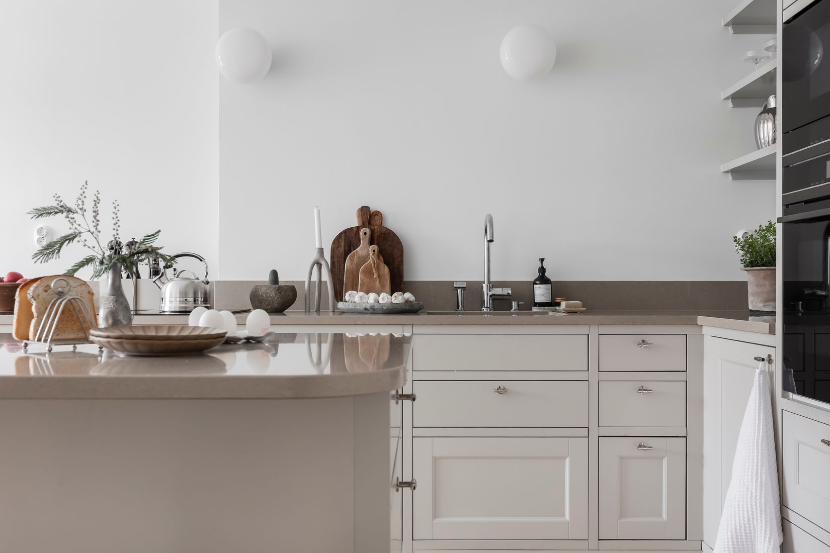 Ljust och rymligt vardagsrum med vackert brädgolv och målade väggar. Rummet erbjuder goda möbleringsmöjligheter för både soffgrupp och umgänge, med klassiska proportioner som är typiska för sekelskifteslägenheter. i anslutning till vardagsrummet ligger bostadens stilrena kök. Köksinredning från Marbodal med beige luckor som kombineras med kompositbänkskiva och stänkskydd i samma material för ett enhetligt uttryck. Köket är fullt utrustat med induktionshäll, inbyggnadsvarmluftsugn, inbyggnadsmikro, diskmaskin samt kyl och frys. En välplanerad och funktionell köksmiljö med moderna materialval i klassisk tappning.