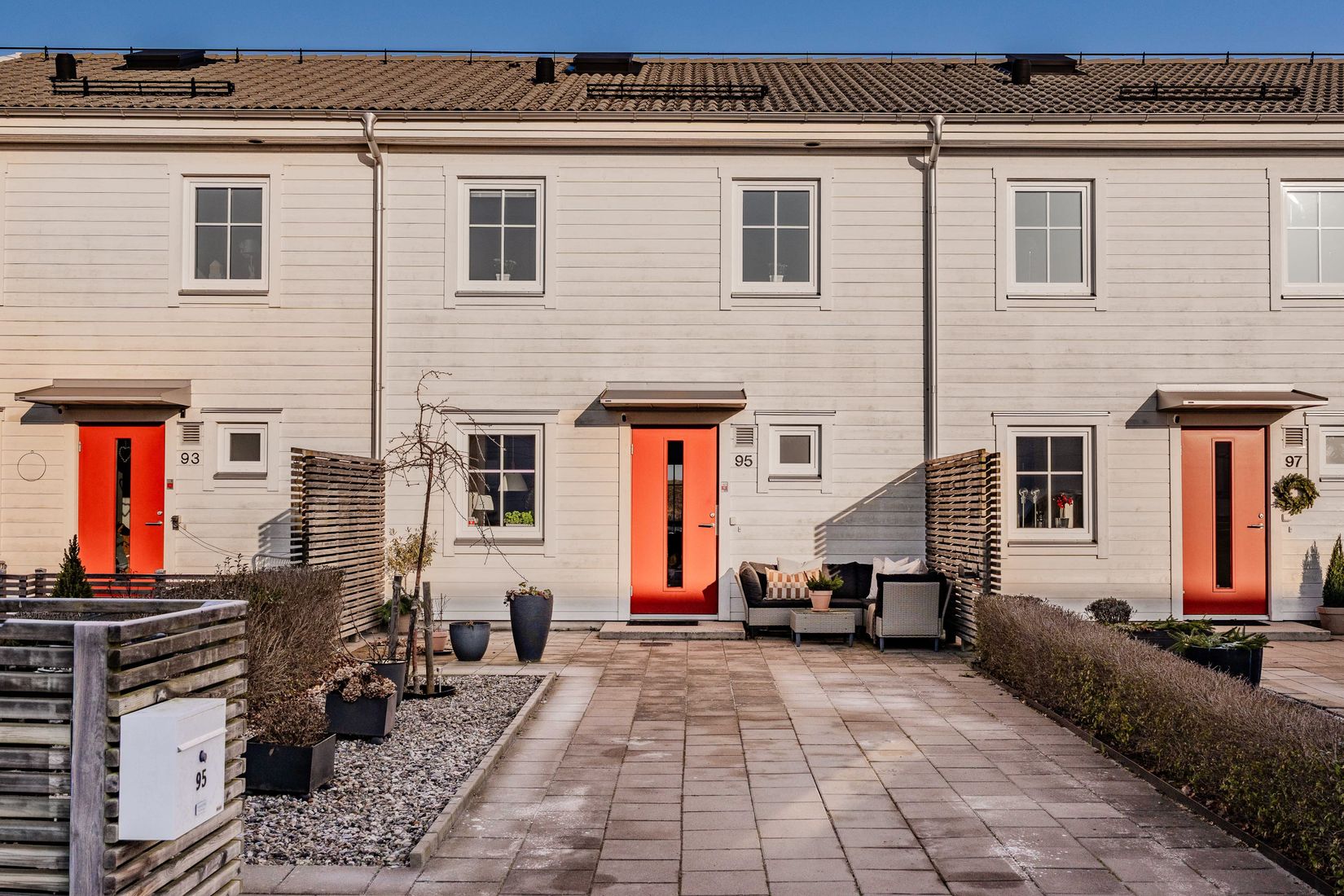 Framsidan är stenlagd och erbjuder plats för parkering.