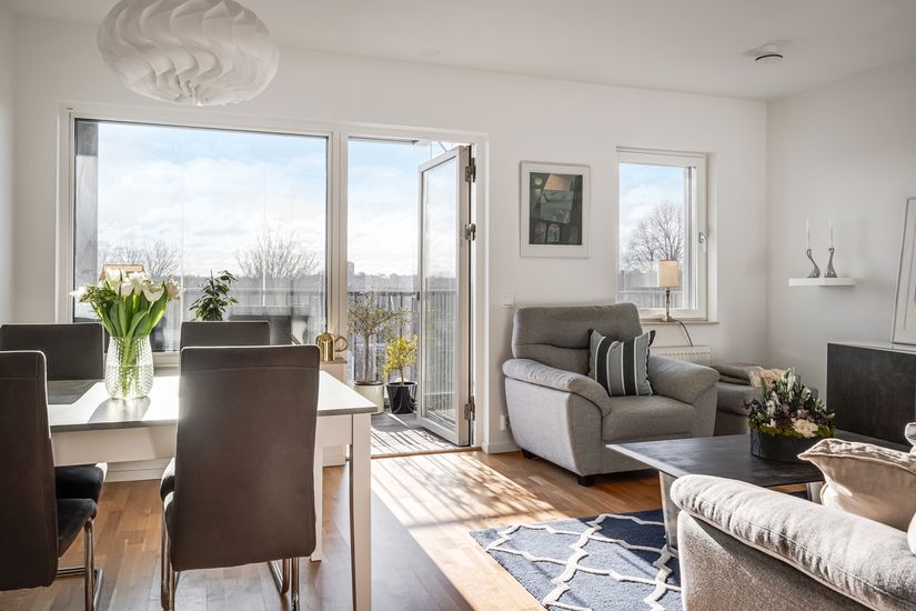 Här bor du med närhet till affärer, apotek och kommunikationer. Hissen från markplan tar oss upp till våning fyra där vi når lägenheten via loftgång. Lägenheten är ljus, inbjudande och privat, helt utan insyn. Fina materialval och sobra färger ramar in ett trivsamt och lugnt hem.