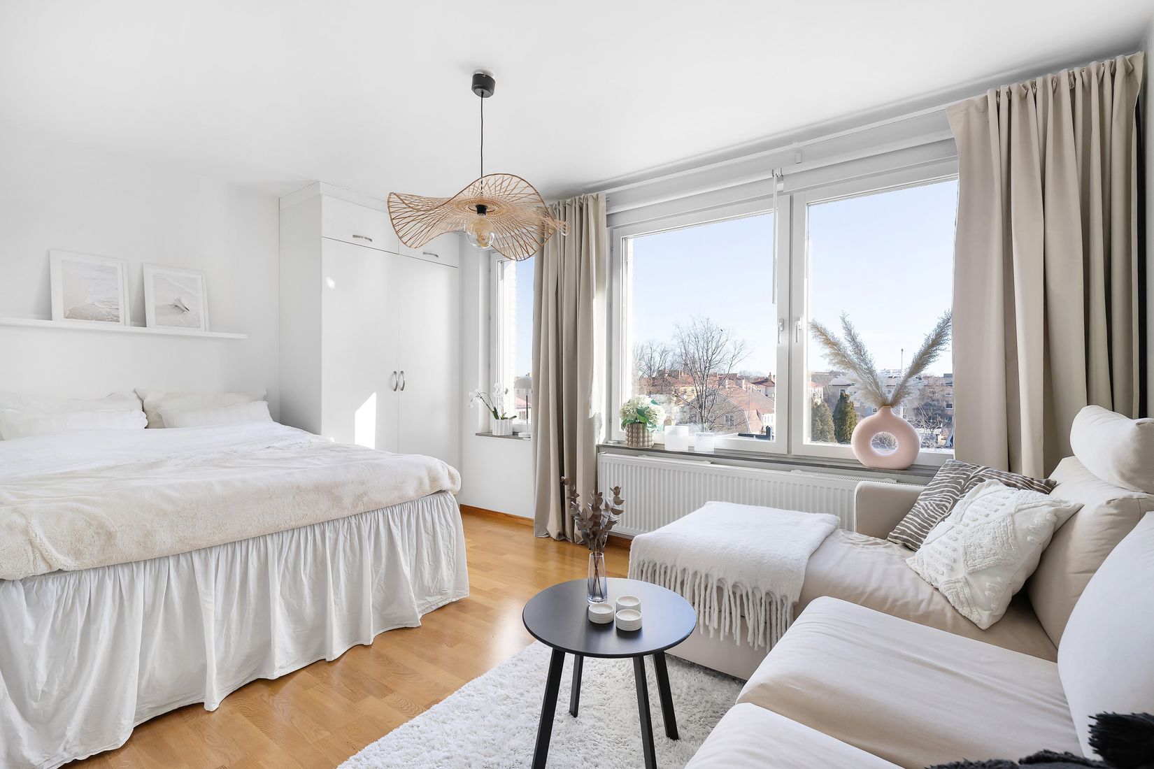 Bostaden präglas av genomgående fina materialval och hög standard. Köket är fullt utrustat med diskmaskin och i lägenheten finns även kombinerad tvättmaskin och torktumlare för extra bekvämlighet. I anslutning till hallen ligger köksdelen och allrummet, som rymmer både soffa och säng på ett smart sätt. Tack vare gavelläget har bostaden fönster i tre väderstreck, vilket ger ett generöst ljusinsläpp och en luftig känsla.
