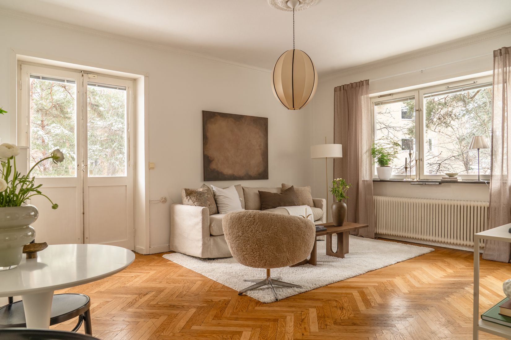 Lägenheten har ett eftertraktat gavelläge med generöst ljusinsläpp från tre väderstreck, vilket skapar en ljus och luftig atmosfär. De 56 kvadratmeterna är synnerligen välplanerade och upplevs större än vad ytan antyder. Här möts du av vackra och tidstypiska 40-talsdetaljer såsom fiskbensparkett i ek, fönsterbänkar i massiv svart sten, spanjoletter, generös takhöjd samt genomgående ljusa ytskikt.
