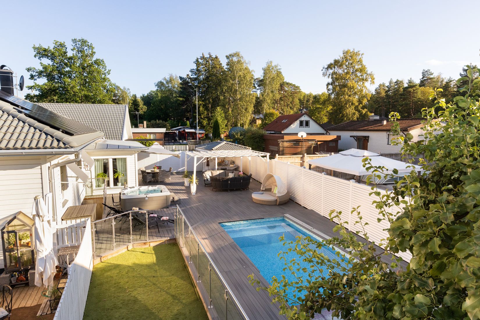 Den insynsskyddade tomten är något alldeles extra, här har du möjlighet att njuta under sommarhalvåret, pool, utespa och ett väl tilltaget utekök som skapar en härlig semesterkänsla hemma. Här finns gott om plats för umgänge och avkoppling under årets varmare månader.