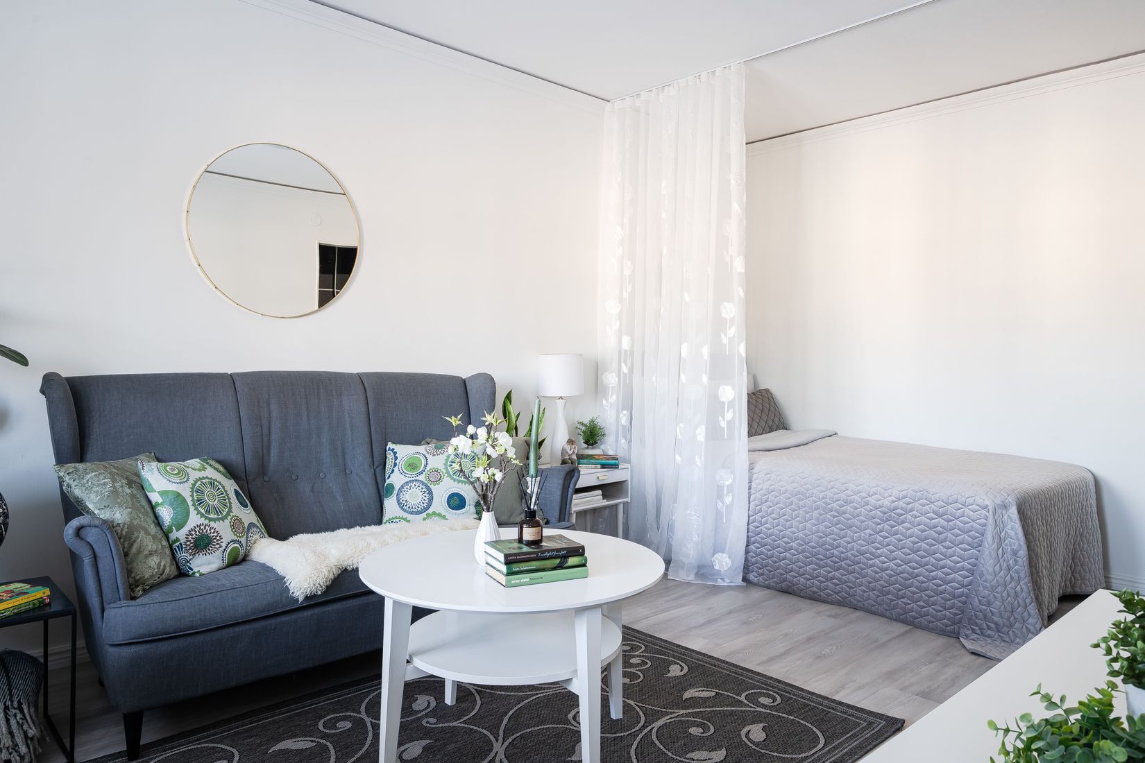 Du välkomnas av en hall med mycket goda förvaringsmöjligheter tack vare praktiska skjutgarderoben. Badrummet är stilrent med kakel och klinker. Allrummet, som kombinerar vardagsrum och sovdel, erbjuder plats för både soffgrupp och säng – en smart planlösning som gör det enkelt att möblera efter behov. Genomgående fina ytskikt med ljusgrått laminatgolv och ljusa väggar skapar en modern och trivsam känsla.