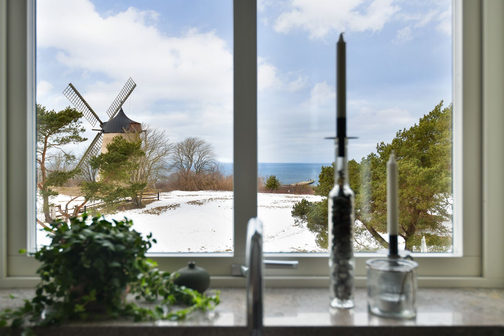 Det smakfulla och inbjudande köket från Smedstorp erbjuder generösa arbetsytor och gott om förvaring. Här finns nya vitvaror från 2023 och en detalj som verkligen sätter guldkant på tillvaron: havsutsikt medan du diskar.