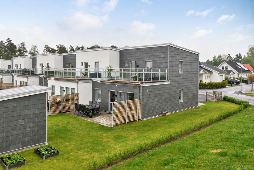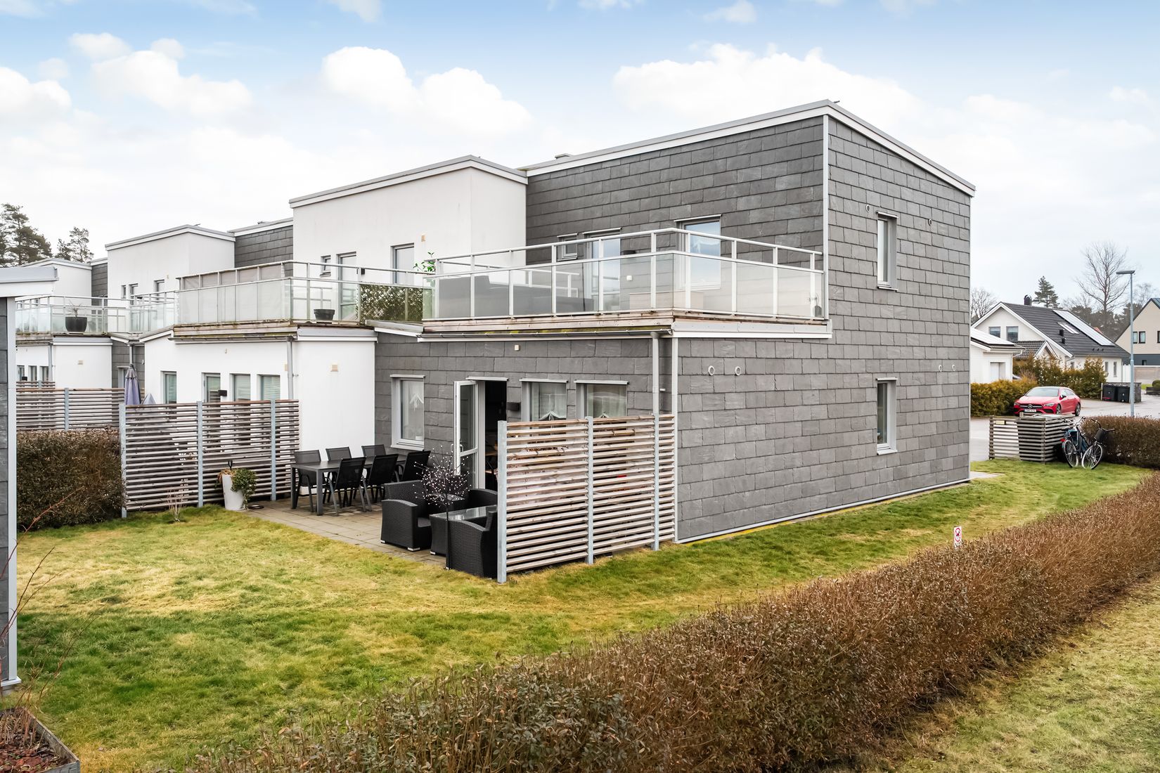Den gröna hörntomten ger extra rymd och avskildhet jämfört med många andra radhus. Här finns ett rymligt förråd samt en uppfart med plats för två bilar praktiskt och bekvämt för både boende och gäster.