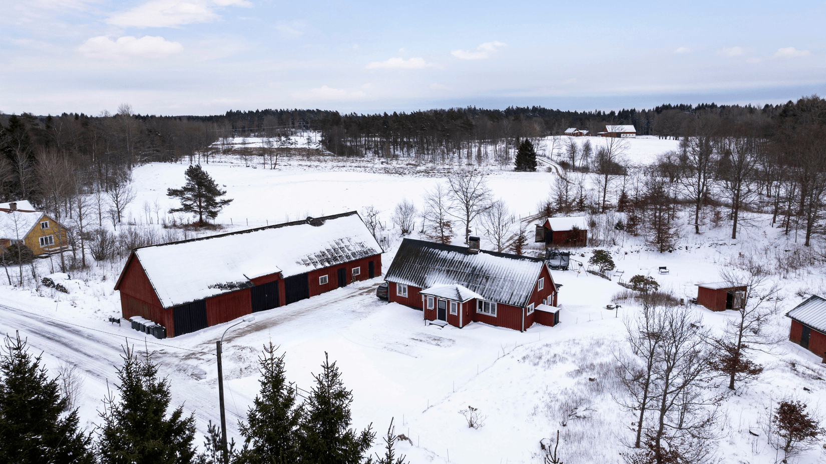 Till fastigheten hör även uthusbyggnader om totalt ca 300 kvm byggyta, med goda användningsmöjligheter för exempelvis djurhållning, förvaring, verkstad eller hobbyverksamhet.