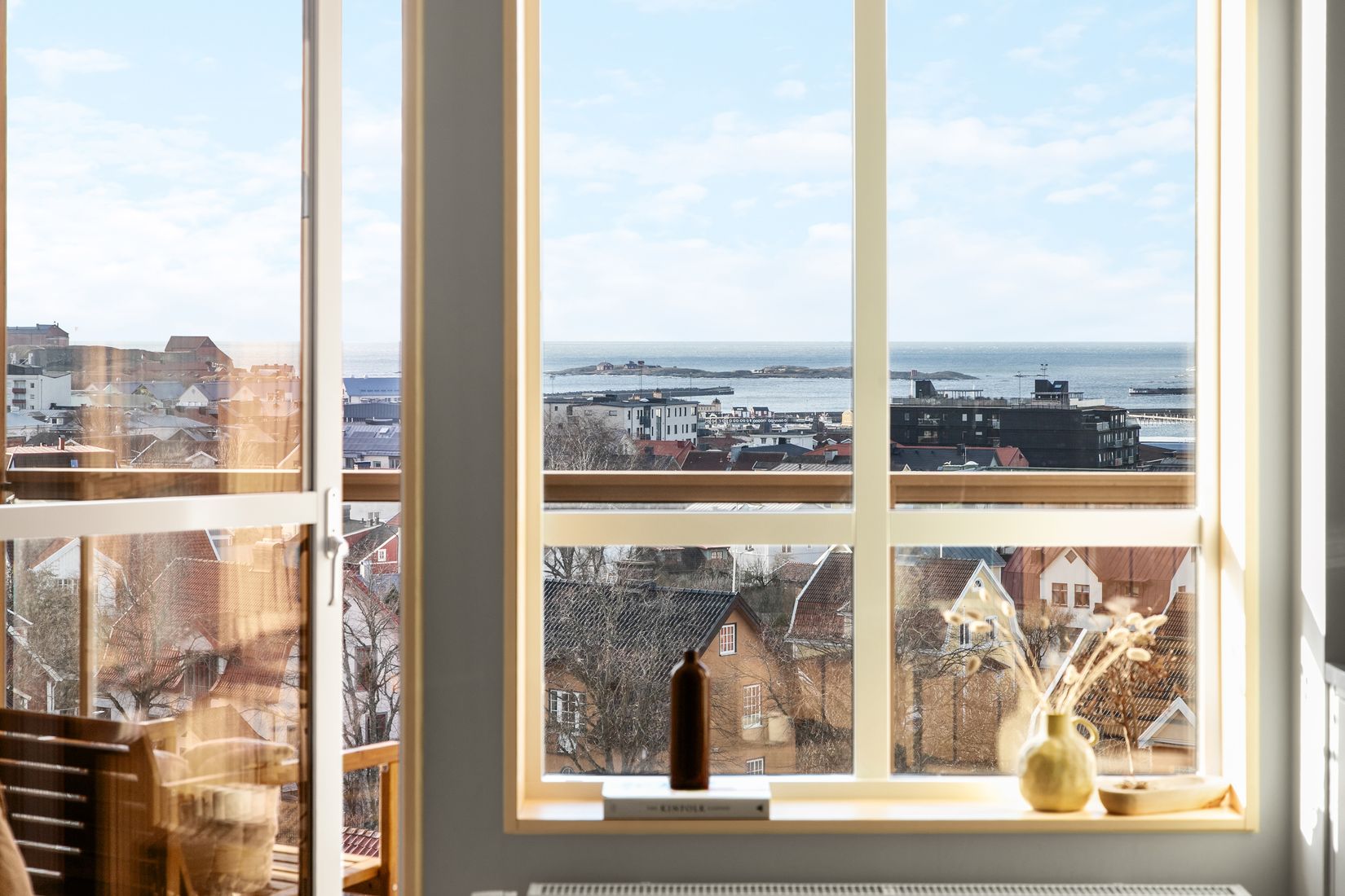 Välkommen till en ljuvlig etta högst upp i huset – på sjätte våningen – där stadens siluett möter det glittrande Kattegatt och Varbergs fästning reser sig i horisonten. Här bor du insynsskyddat, i soligt läge och med en vidsträckt utsikt som är lika magisk en stilla morgon som en varm sommarkväll.