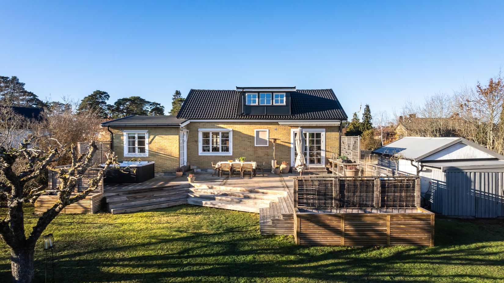 Utvändigt väntar ett stort, härligt trädäck i soligt sydostläge där både morgon- och förmiddagsljuset ligger kvar länge. Här finns ett spabad som bjuder in till avkoppling året runt, samt odlingslådor för dig med gröna fingrar. Trädgården är lättskött men erbjuder samtidigt gott om plats för lek, studsmatta eller sommarens aktiviteter.