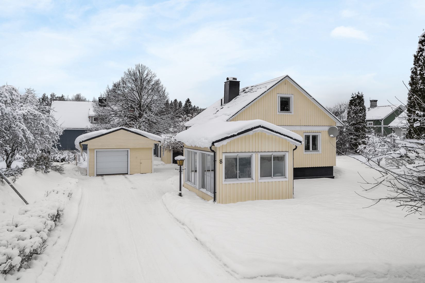Huset är utrustat med fiber och bergvärme, vilket ger både snabb uppkoppling och energieffektiv uppvärmning. På tomten finns dessutom ett uterum med kök, garage med mekanisk port, gästhus samt maskinförråd – utmärkta komplement som skapar många möjligheter för både boende, hobby och förvaring.
