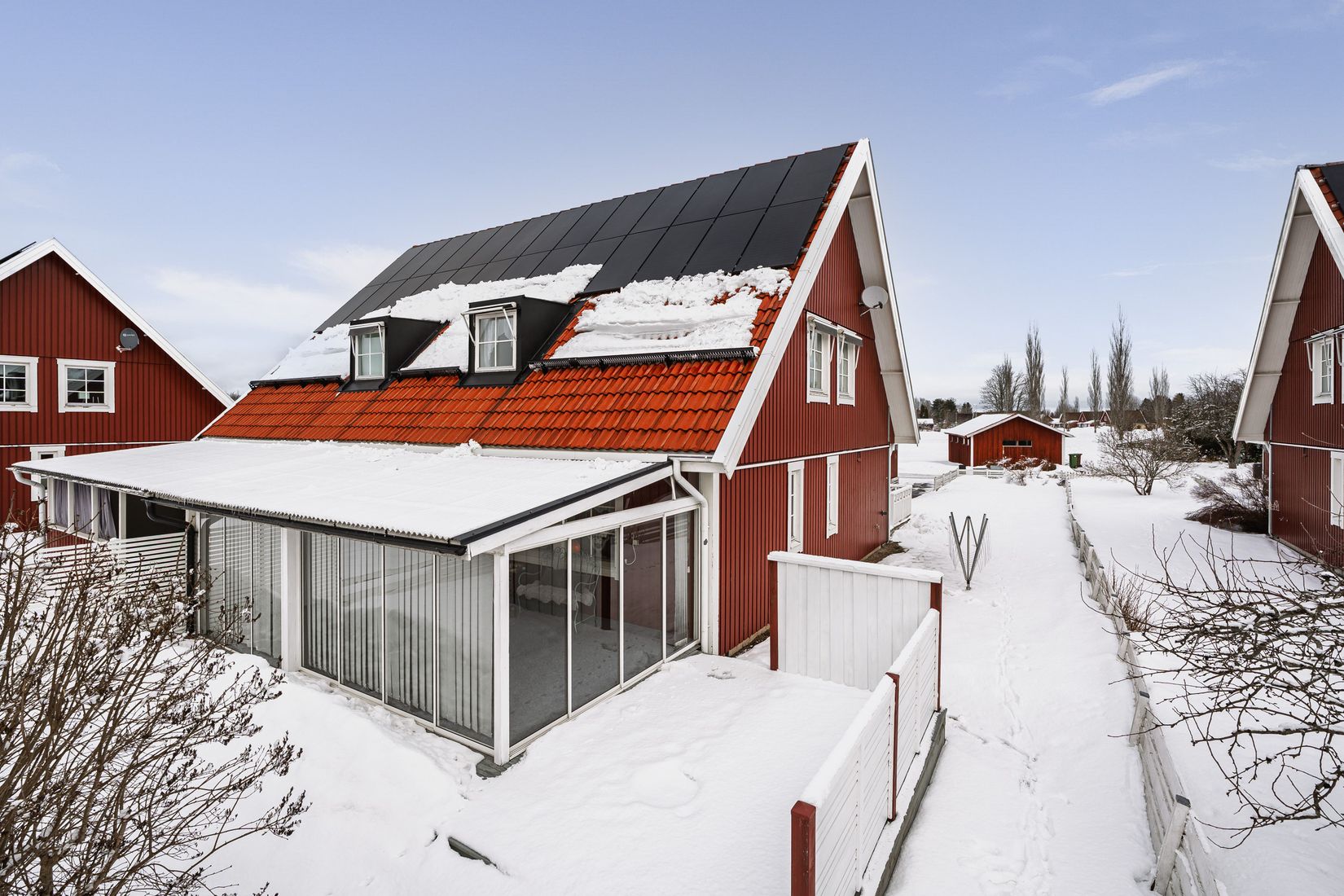 Här finns en inglasad altan med ett soldäck utanför i söderläge, perfekt för avkoppling och socialt umgänge. På framsidan av huset finns även ett tralldäck samt en tomt med äppelträd, rabarber, pion och syrén som skapar en härlig trädgårdsmiljö. Förvaringsmöjligheterna är goda med både carport och förråd.