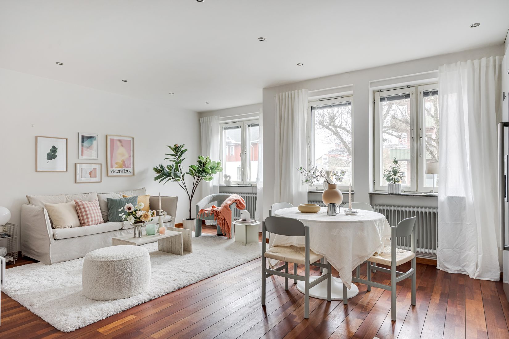 Den öppna och sociala planlösningen mellan kök och vardagsrum skapar generösa umgängesytor med gott om plats för både middagar och sociala tillställningar. Sovrummet är rofyllt beläget i svalt norrläge mot den tysta innergården.