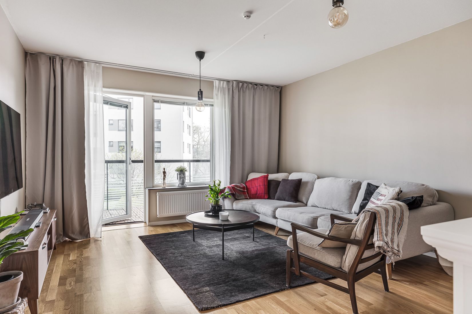 Bostaden erbjuder en öppen och social planlösning där kök och vardagsrum smälter samman på ett naturligt sätt. De stora fönsterpartierna ger ett härligt ljusinsläpp och skapar en luftig känsla. Från vardagsrummet nås den generösa balkongen som vetter mot den lugna och trivsamma innergården – en självklar favoritplats för morgonkaffet, middagar eller avkoppling under årets varmare månader.
