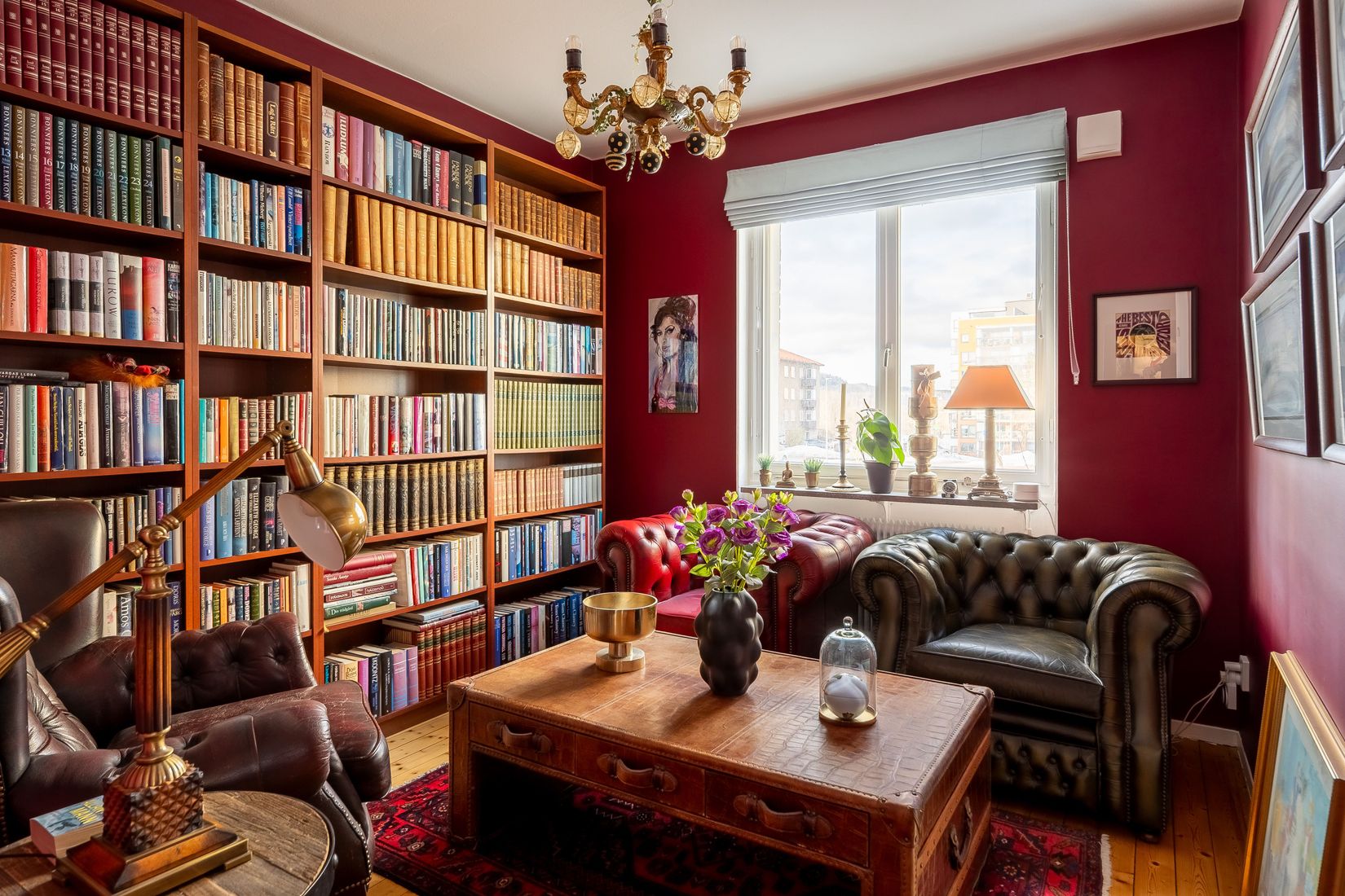 Köket är ljust med generösa arbetsytor, bra förvaring och fint ljusinsläpp från fönstret. Intill hallen ligger det rymliga badrummet, utrustat med dusch, wc, handfat med kommod, spegelskåp med både belysning och förvaring. Här finns även både tvättmaskin och torktumlare, vardagslyx. Lägenheten erbjuder vidare två trivsamma sovrum. Det större rymmer både dubbelsäng och garderobsvägg, medan det andra passar utmärkt som barnrum, gästrum eller kontor. Eller varför inte som idag? Inrett som ett mysigt bibliotek, fyllt med böcker och härliga Chesterfieldfåtöljer – ett perfekt rum för lugna stunder, härligt umgänge och avkoppling. Vackra trägolv finns i samtliga sovrum.