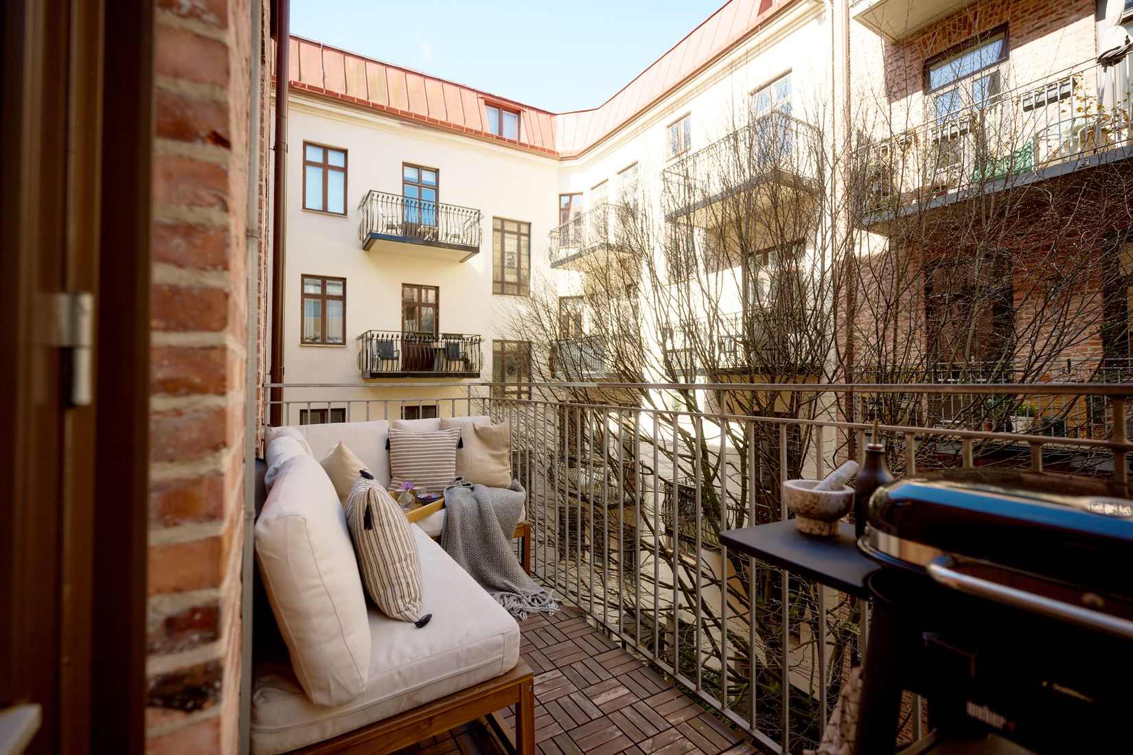 Den stora balkongen vetter in mot den rofyllda gården.