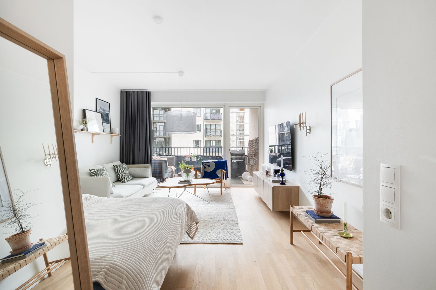 Genomgående för hela bostaden är ljus ekparkett och golvvärme, där en tilltagen takhöjd och stora fönster löper ända från golv till tak i allrummet och öppnar upp mot den stora balkongen i härligt solläge. Här kan du njuta många timmar på dagen med kaffekoppen i handen. Läget känns dessutom privat. Vill du utöka space så ta med vännerna upp till takterrassen för skönt häng.