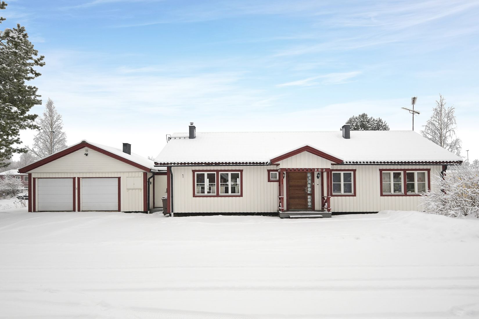 Välplanerat hus med vidbyggt garage, tre rymliga sovrum samt ett stort vardagsrum som är möjligt att dela upp till ett ytterligare sovrum.