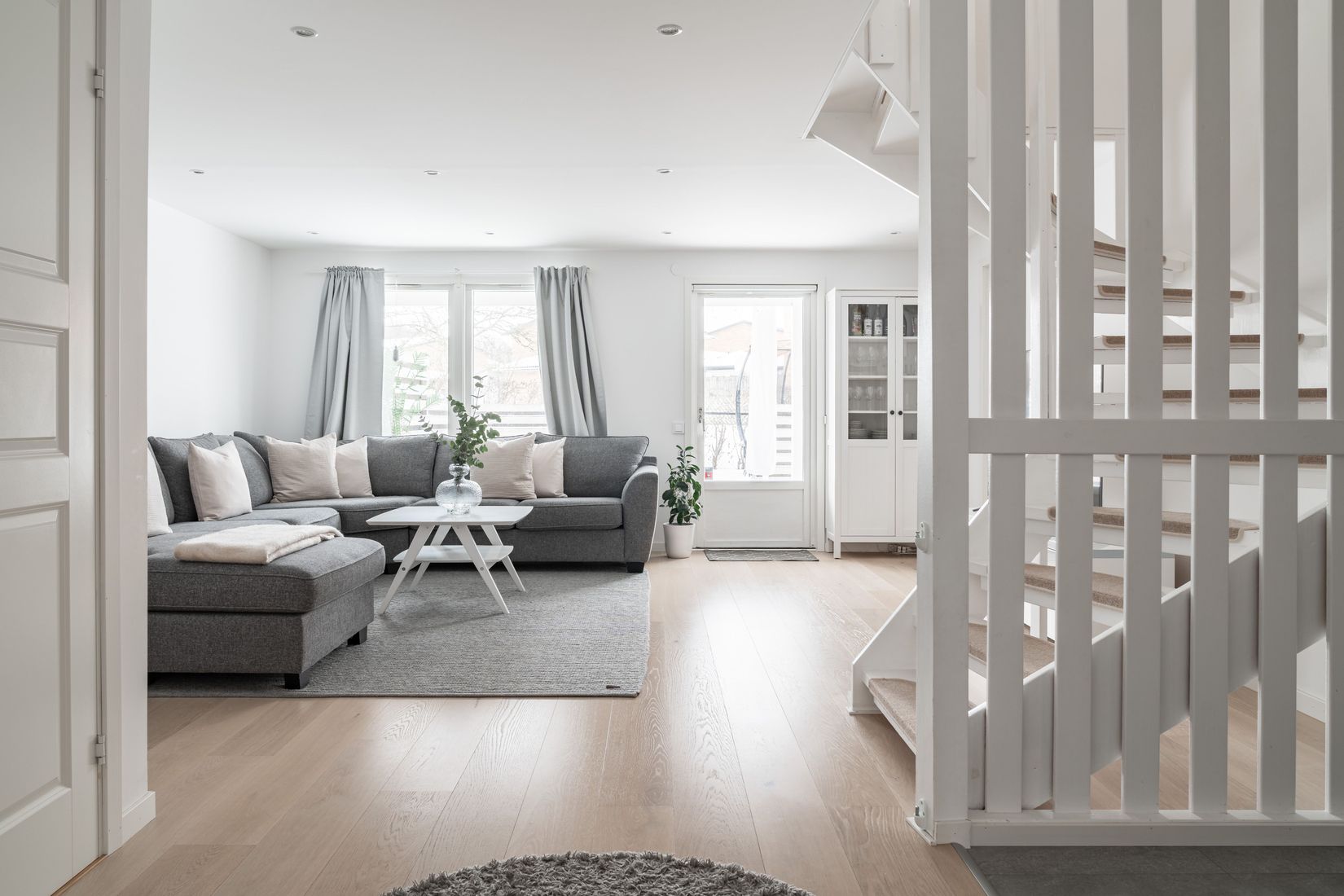 Redan vid första steget in möts du av en ljus och inbjudande atmosfär. Entréplanet erbjuder ett generöst vardagsrum med stora fönsterpartier och direkt access till en träbelagd uteplats i soligt västerläge – en perfekt plats för avkoppling, middagar och sociala stunder. Det smakfullt uppdaterade köket bjuder på stilrena materialval och goda arbetsytor, kompletterat av en praktisk tvättstuga.