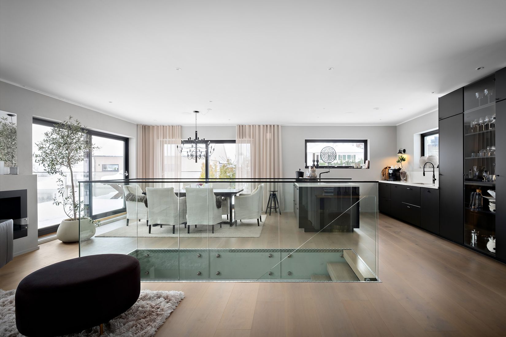 Övre plan präglas av öppna, ljusa och representativa sällskapsytor där stora glaspartier skapar ett fantastiskt ljusinsläpp och en naturlig kontakt med den rymliga terrassen med glasräcke. Här suddas gränsen mellan inne och ute ut, vilket gör terrassen till en självklar förlängning av umgängesytorna.