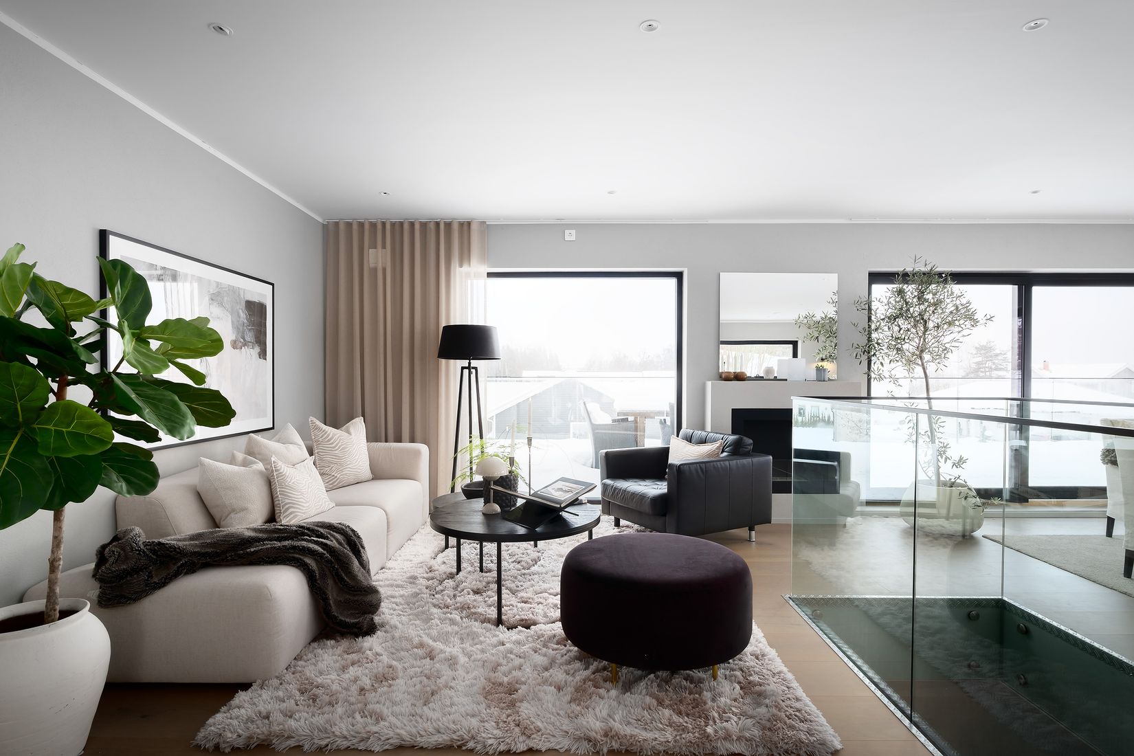 Entrén välkomnar med en stilren och harmonisk interiör där infälld belysning, dämpad färgskala och exklusiva materialval skapar en lugn och sofistikerad atmosfär. Den öppna trappan med massiva steg och glasräcke binder samman våningsplanen och förstärker
