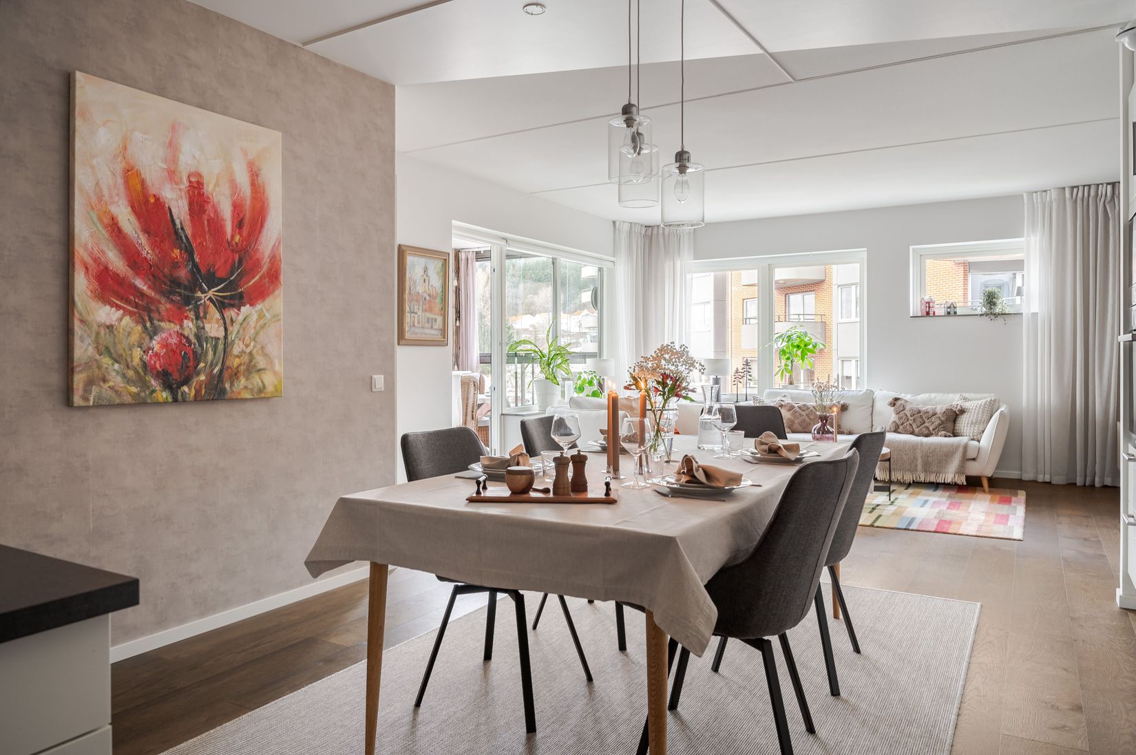 Från vardagsrummet kliver du rakt ut på den stora inglasade balkongen i sydvästläge, en plats som snabbt blir hemmets favorit. Här suddas gränsen mellan ute och inne ut, och tack vare inglasningen och de stilrena lamellgardinerna kan du enkelt anpassa ljuset efter både humör och årstid. Tidig vårmorgon när solen försiktigt värmer genom glaset och kan man njuta med en kopp kaffe och höra hur området sakta vaknar. Under sommaren blir balkongen ett självklart extrarum, perfekt för långa frukostar, middagar med vänner eller en stilla stund med en bok medan kvällssolen dröjer sig kvar. När hösten kommer fortsätter du att njuta av utsikten, skyddad från vind och regn, medan löven skiftar färg utanför.