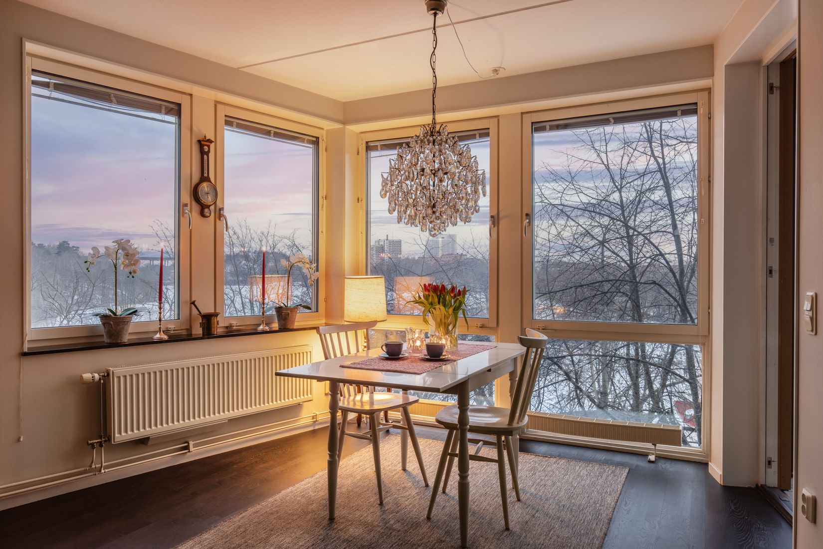 Bostaden är optimalt belägen, precis intill Trekanten och Liljeholmstorgets galleria med bra shopping, flertalet restauranger, caféer och rikligt med serviceutbud. Mycket bra kommunikationer med både tunnelbana, tvärbana och flygbussar ett stenkast ifrån bostaden. Området är populärt tack vare närheten till naturen, service samt badplatser. Under vintertid plogas isbana på Trekantens sjö.