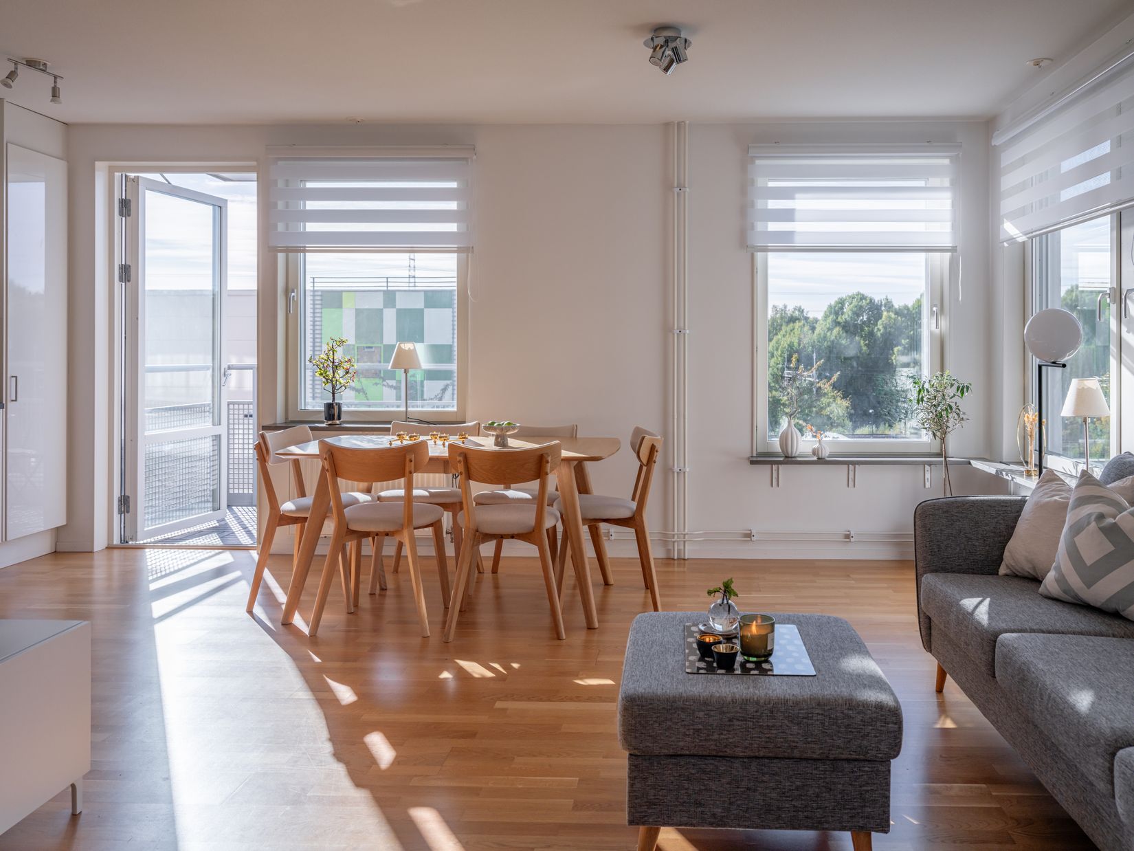 Lägenheten är mycket välplanerad där varje kvadratmeter utnyttjas optimalt. Vardagsrummet rymmer i dagsläget både en stor soffdel och matplats. Vardagsrummet är så pass generöst att man tack vare gavelläget kan dela av och på så sätt fått till ett mindre sovrum med fönster och skjutdörr - perfekt som ett barnrum eller gästrum/arbetsrum, men skulle även kunna användas som ett föräldrasovrum då en dubbelsäng skulle få plats. Badrummet har dusch med duschväggar i glas samt en praktisk tvätthörna med arbetsbänk och överskåp ovan tvättmaskinen. Övrig utrustning är wc, tvättställskommod, spegelskåp samt högskåp.