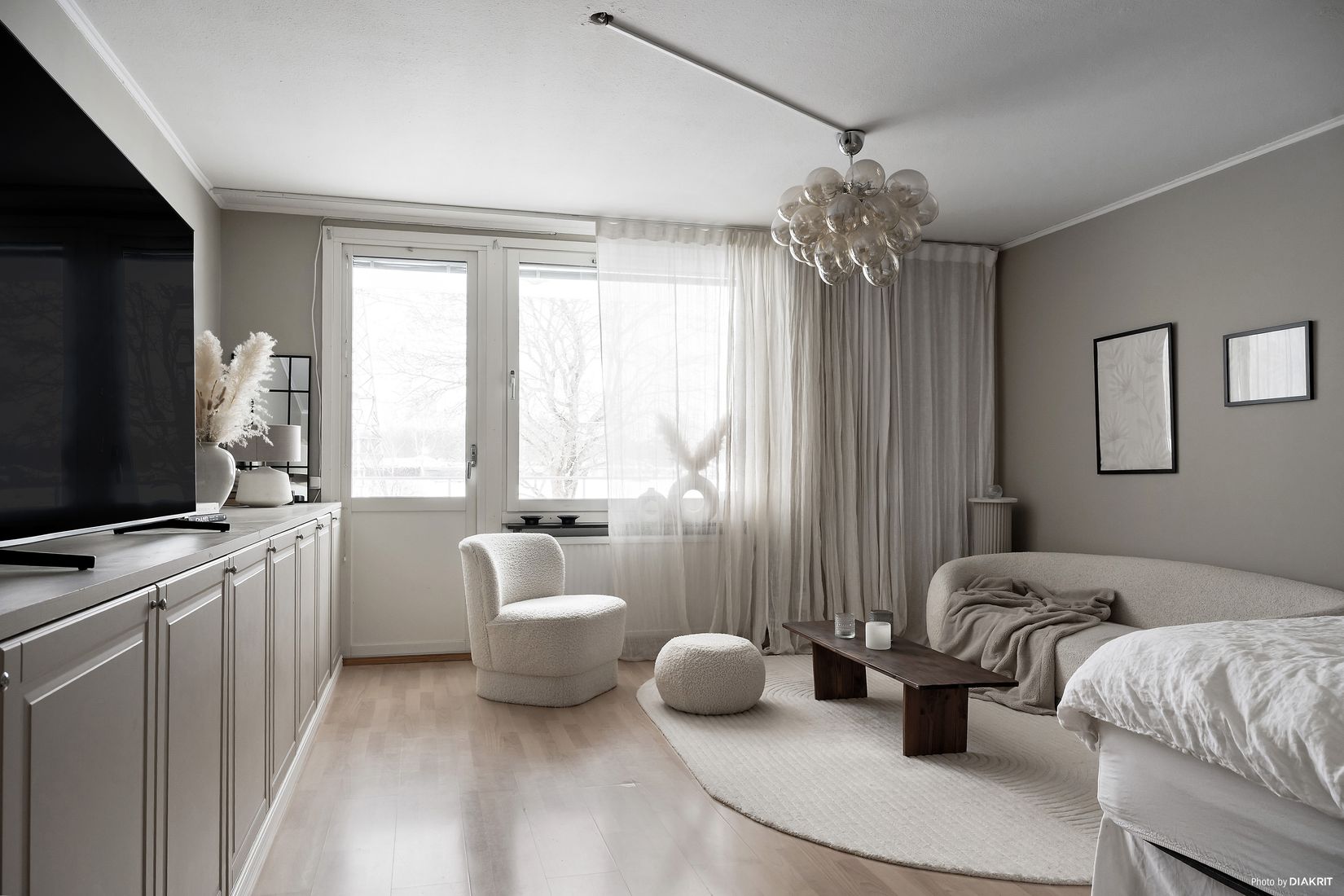 Här erbjuds en ljus och välplanerad bostad med ett härligt hörnläge som ger ett generöst ljusinsläpp från flera väderstreck. Lägenheten präglas av genomgående ljusa färgval och en modern, harmonisk känsla som gör det enkelt att trivas från första stund. Allrummet är rymligt och lättmöblerat med plats för både säng och soffgrupp. De stora fönsterpartierna skapar en luftig atmosfär och förstärker känslan av rymd. Den platsbyggda förvaringen är både stilren och funktionell och ger gott om smarta förvaringslösningar utan att ta onödig yta i anspråk. Köket är praktiskt planerat och badrummet är fräscht och funktionellt. Från rummet nås den stora balkongen – en riktig höjdpunkt! Här kan du njuta av lugnet och den öppna utsikten, en perfekt plats för morgonkaffet, avkoppling i solen eller ljumma sommarkvällar.