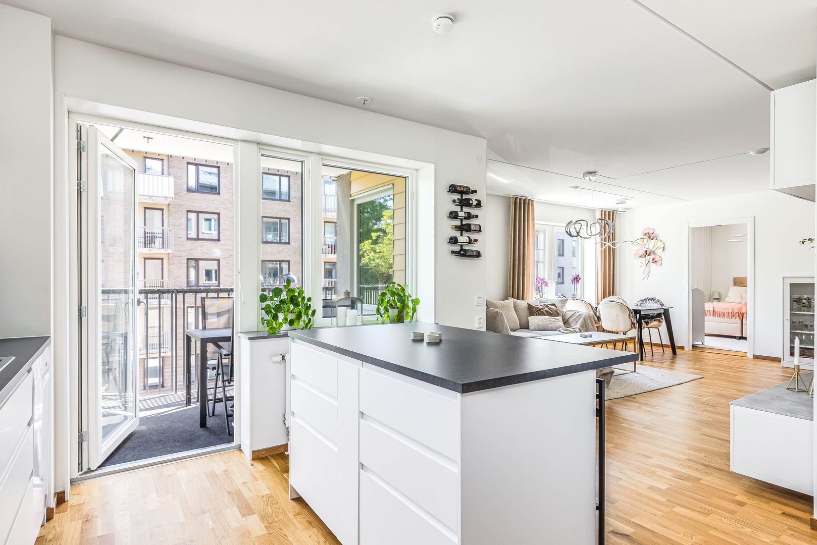 Rummen disponeras enligt ett stilrent kök i vitt som erbjuder köksö med bra arbetsytor och förvaring samt utgång till generös balkong med optimalt läge. Socialt vardagsrum i öppen planlösning mot köket som rymmer plats för soffgrupp och matmöbel. Det stora sovrummet är välplanerat och rymmer dubbelsäng samt gott om förvaring i form av större garderob medan det mindre sovrummet erbjuder en separat klädkammare med inredningssystem. Helkaklat stort badrum i sobra färger samt tillhörande tvättavdelning med tvättmaskin, torktumlare, bänkyta och förvaring.