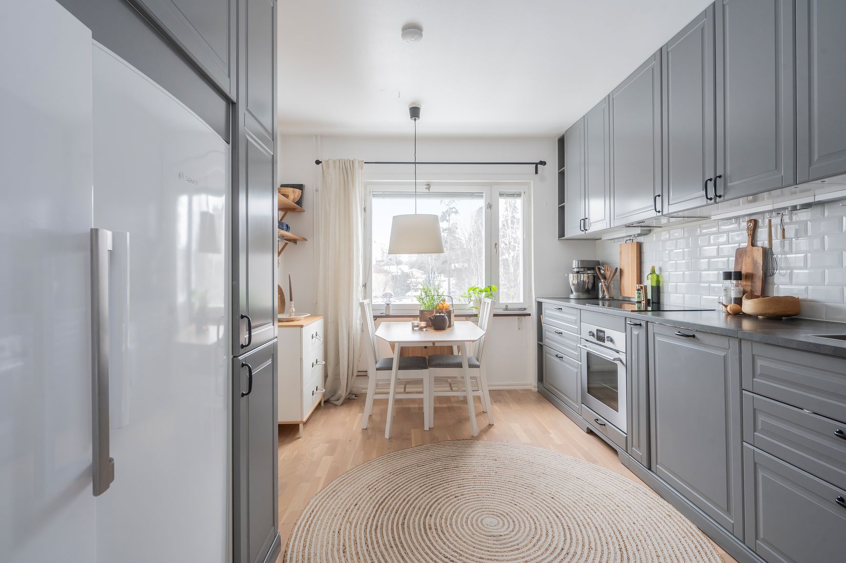 Köket är generöst tilltaget med bra arbetsytor och gott om förvaring, perfekt för både vardagsmatlagning och sociala tillställningar. Här finns matplats för fyra personer, kakel ovanför diskbänk, fläktkåpa, spis med varmluftsugn, kyl och frys samt diskmaskin.