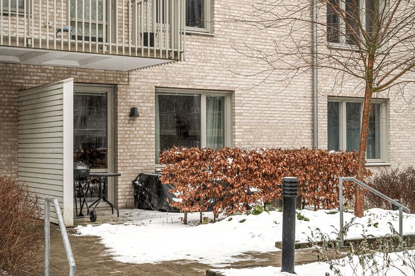Bostaden är belägen på bottenplan och erbjuder en generös privat uteplats om ca 9 kvm, som blir en naturlig förlängning av lägenheten. Här finns gott om plats för loungemöbler, odlingar och sköna sommarkvällar – en riktig bonus som är svår att hitta i en lägenhet i denna storlek.