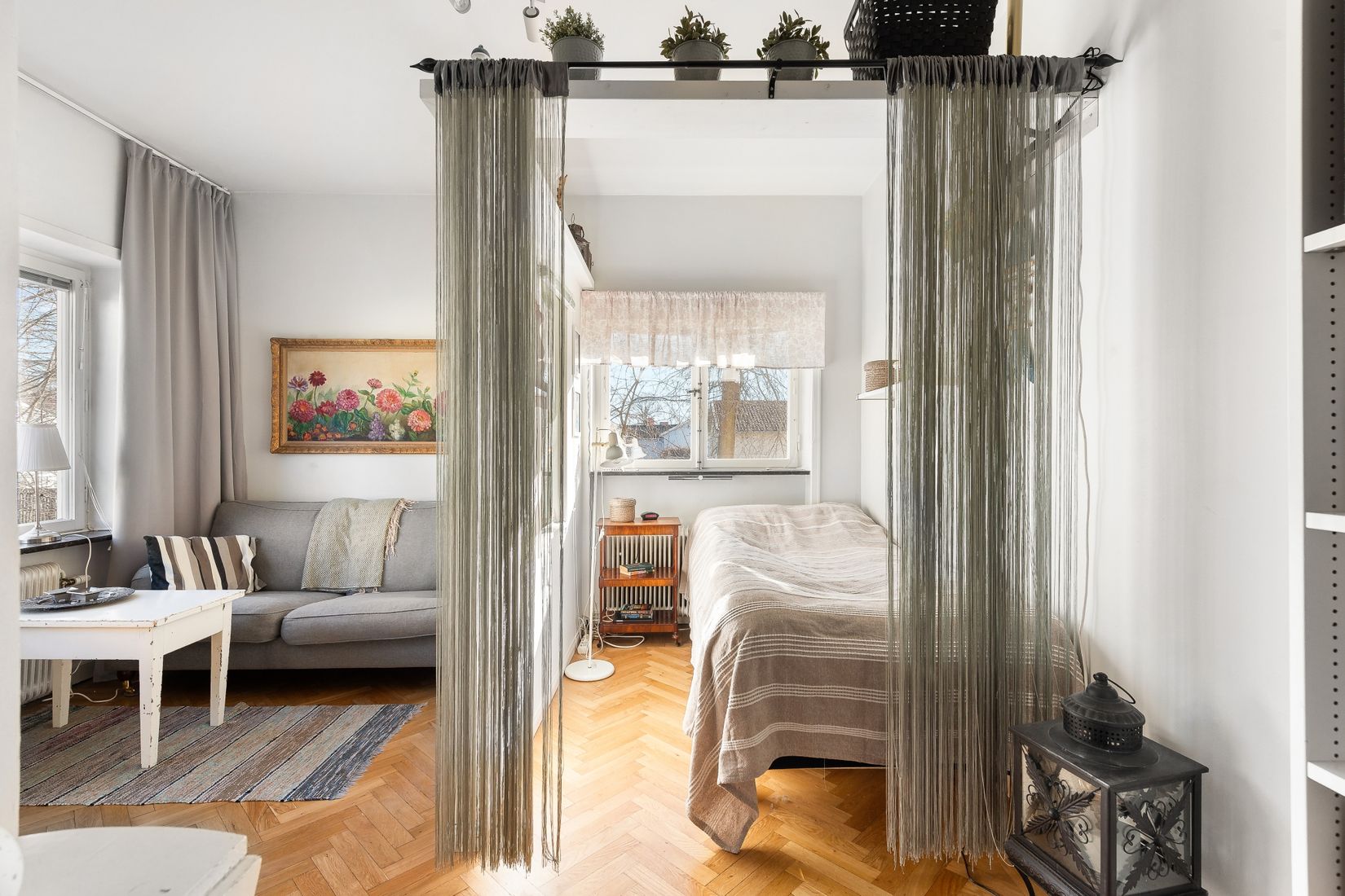 Bostaden är genomgående ljus och trivsam tack vare flertalet fönster i två väderstreck och ett attraktivt hörnläge. Lägenheten vetter mot fastighetens lugna baksida med grönskande utsikt, vilket ger ett behagligt ljusinsläpp och ett insynsskyddat boende. Planlösningen är både funktionell och väl genomtänkt med ett separat kök utrustat med allt som behövs, ett lättmöblerat vardagsrum samt en rymlig sovalkov med plats för större säng. Det helkaklade badrummet är utrustat med dusch, wc, handfat, tvättmaskin samt goda förvaringsmöjligheter. Här finns även ett fönster som bidrar med naturligt ljus och goda vädringsmöjligheter.