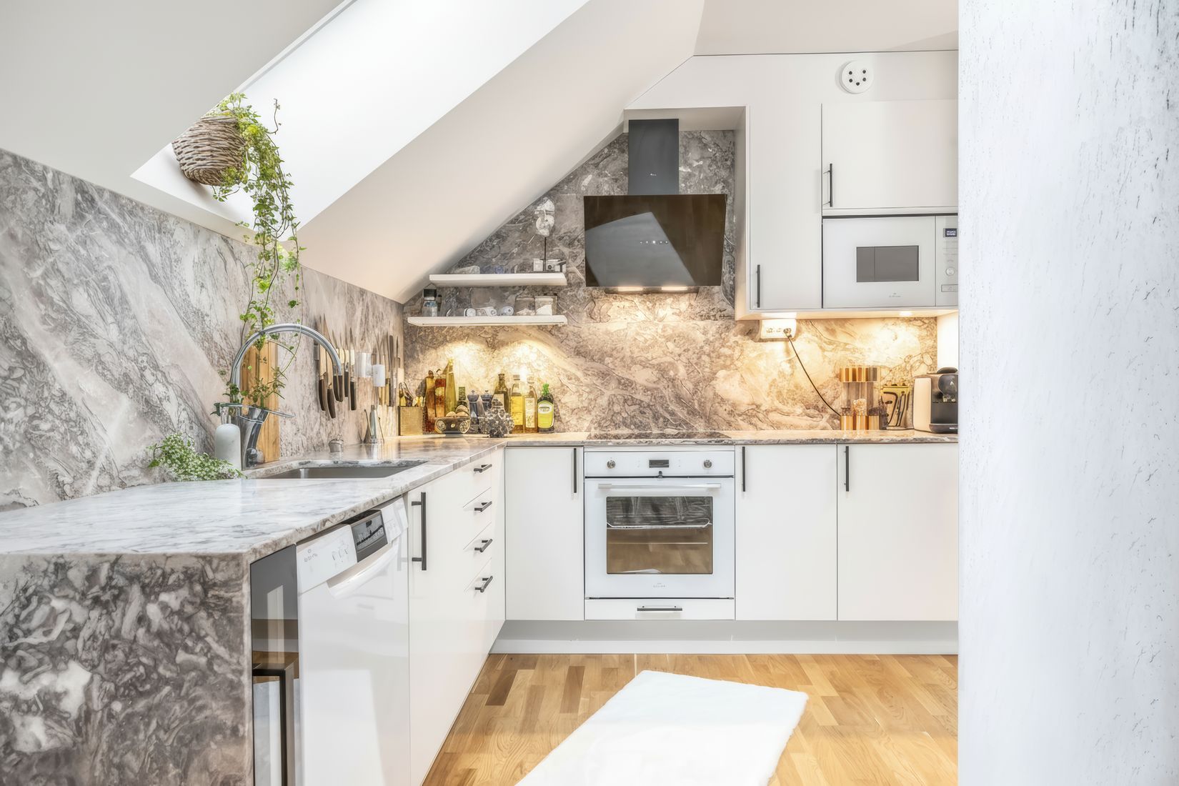 Köket bjuder på charmigt snedtak med takfönster som släpper in ett fantastiskt ljusflöde. Här har du dessutom en mycket påkostad bänkskiva i sten samt vinkyl.