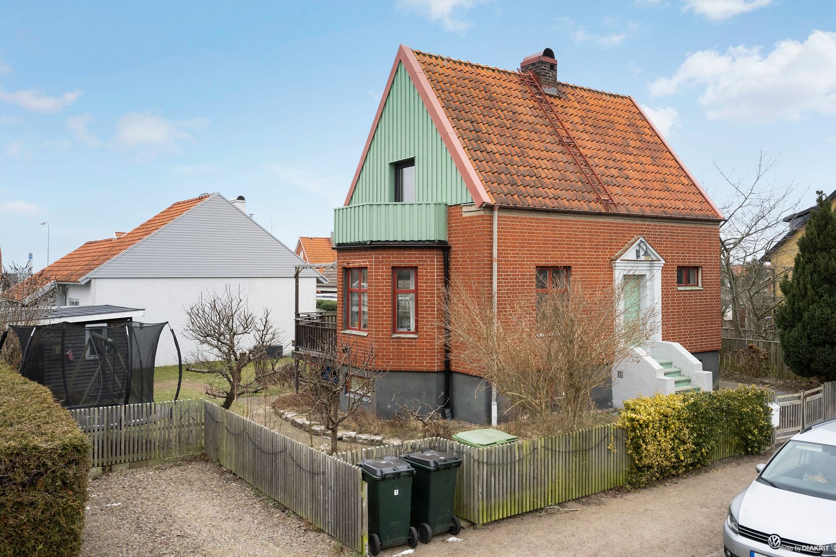 Den lummiga trädgården i soligt västerläge erbjuder ett härligt trädäck och generösa ytor för lek, avkoppling och sociala stunder. Från ovanvåningen skymtar man Öresund och Danmark – en extra detalj som förhöjer känslan.
