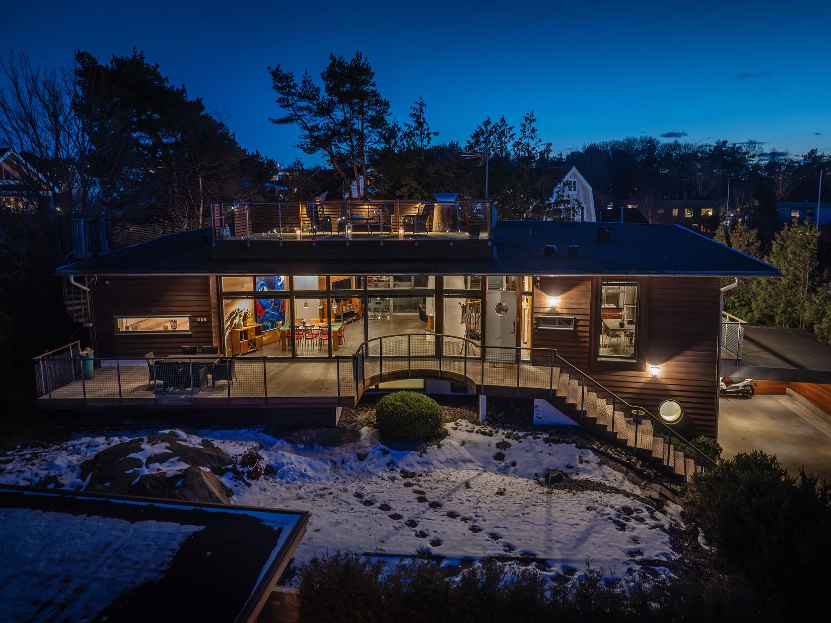 Läget är högt, fritt och sällsynt privat. Sluttningsvillans långa och svagt rundade fasad består till största delen av heltäckande glaspartier kantade av liggande brädfasad. Från stora terrassytor och interiörens magnifika sällskapsytor öppnar sig panoramautsikten ner över sluttningens takåsar och ut över älven och hamnen.