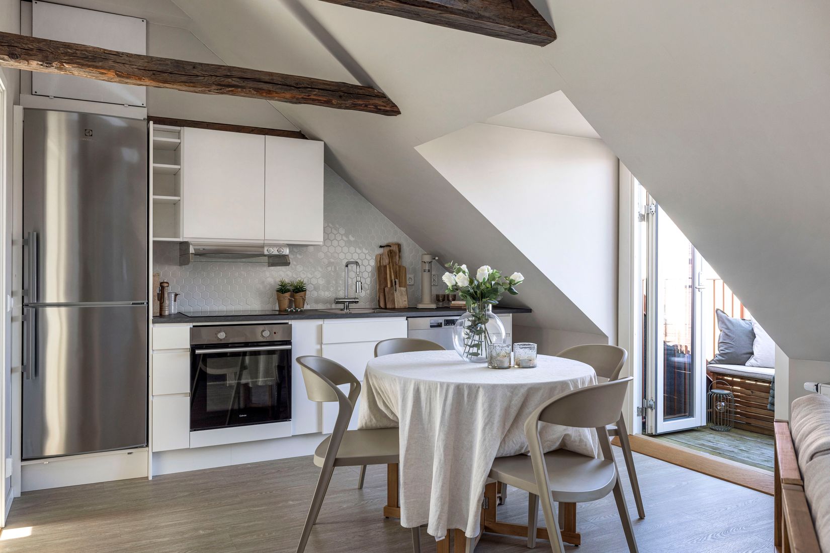 Bostaden präglas av ljus, rymd och karaktär. Det öppna allrummet binder samman kök och vardagsrum i en social och inbjudande planlösning och kompletteras av två mysiga balkonger som förlänger bostaden. Snedtak, synliga takbjälkar och flera takfönster ger lägenheten dess unika vindskaraktär samtidigt som ljuset flödar in från flera håll. Väggarna går i en varm, harmonisk ton som tillsammans med det ljusa golvet skapar en mjuk och trivsam helhet.