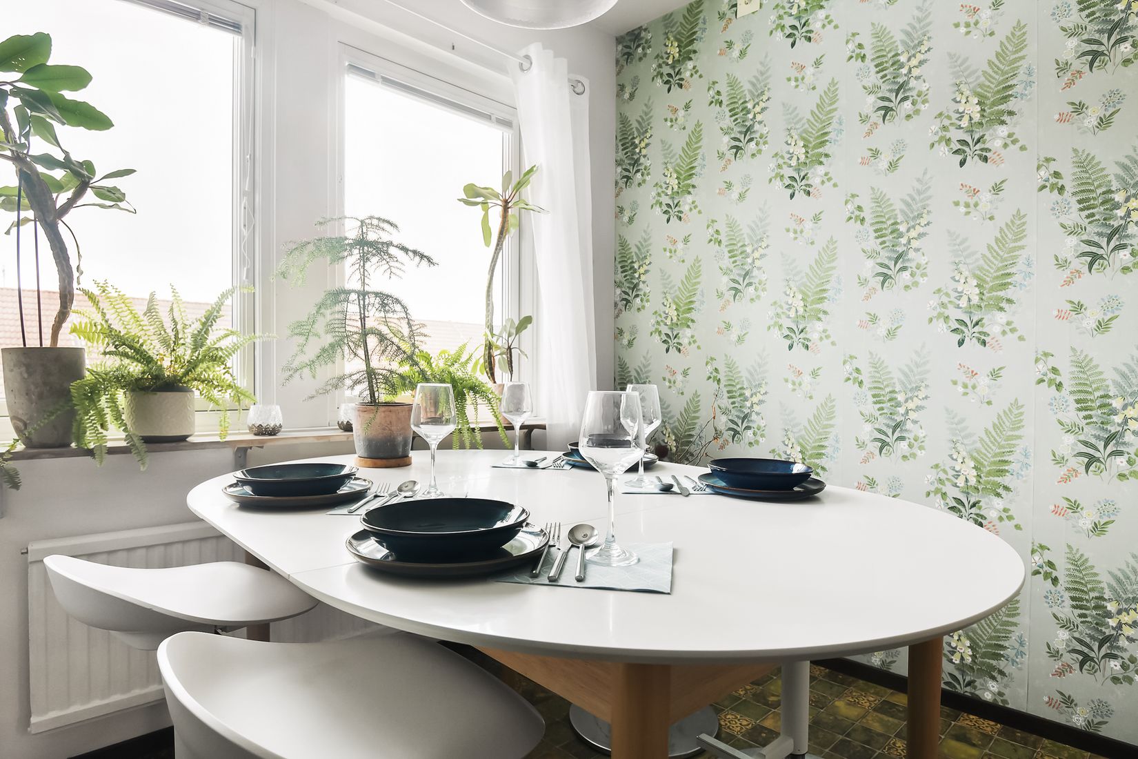 Det ljusa köket har två fönster som släpper in rikligt med dagsljus och skapar en trivsam atmosfär vid både matlagning och måltider. Här finns gott om arbetsytor och plats för matbord. Badrummet är funktionellt utrustat med badkar och egen tvättmaskin som förenklar vardagen.