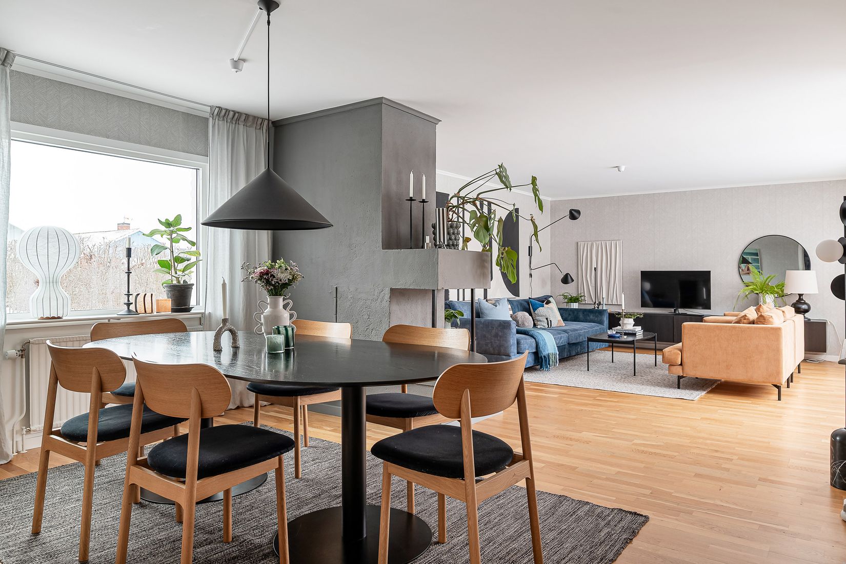 Redan vid första steget in möts du av otroliga sällskapsytor som bjuder in till både vardag och fest. Köket blir hemmets självklara hjärta med en stor köksö som samlar familj och vänner kring matlagning och umgänge. Den öppna planlösningen mot matplats och vardagsrum skapar en luftig och social atmosfär, med gott om plats för såväl stora middagar som mysiga kvällar. Här finns dessutom en öppen spis med pampig murstock som ger både värme och stämning.