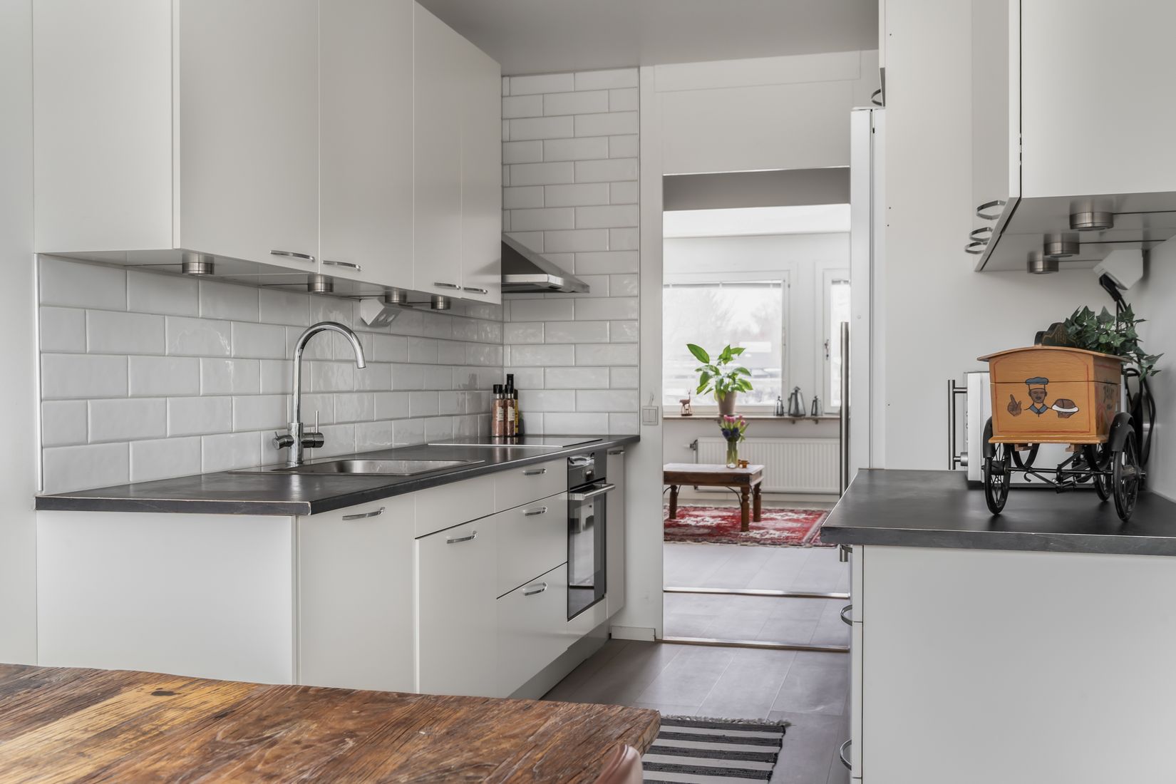 Lägenheten präglas av enhetliga golv genom hela bostaden och en praktisk klädkammare som ligger mellan de två sovrummen - perfekt för smart förvaring. Med genomtänkt planlösning och stilrena ytor är detta ett hem där det bara är att flytta in och trivas.